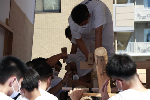 子供山笠は、櫛田神社の清道で櫛田入りを3回披露。タイムが発表されるたびに、桟敷席に入った他の生徒や保護者の人達から温かい拍手が送られました。