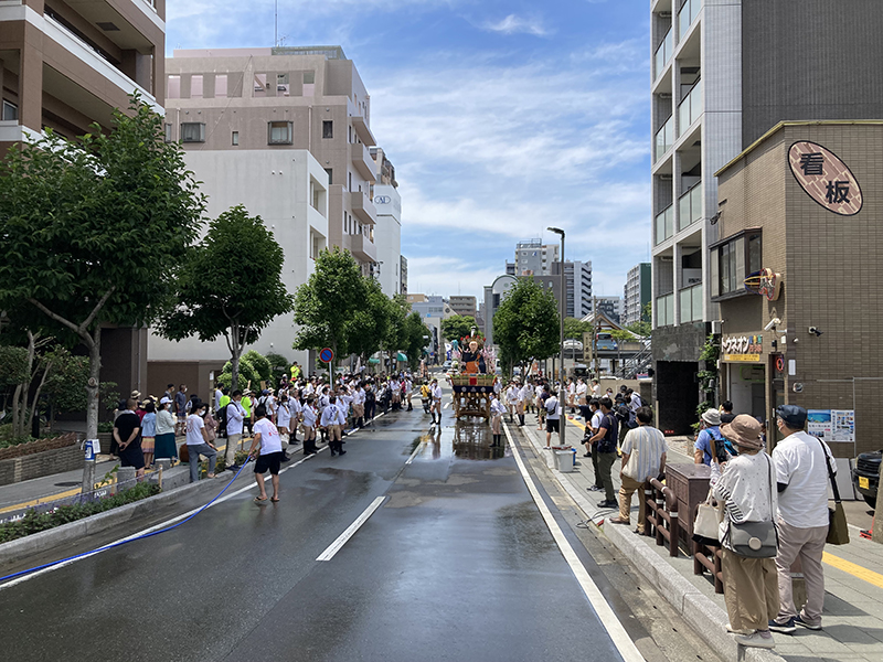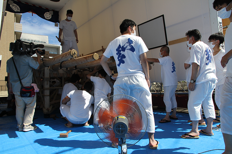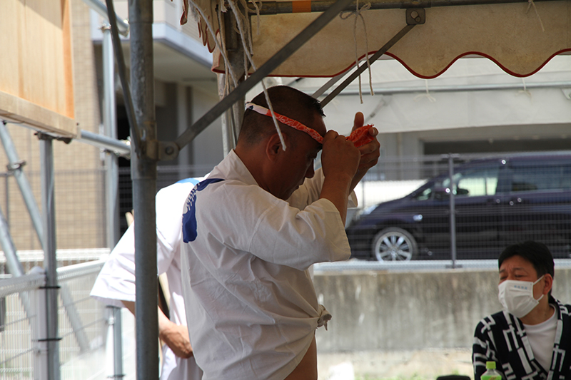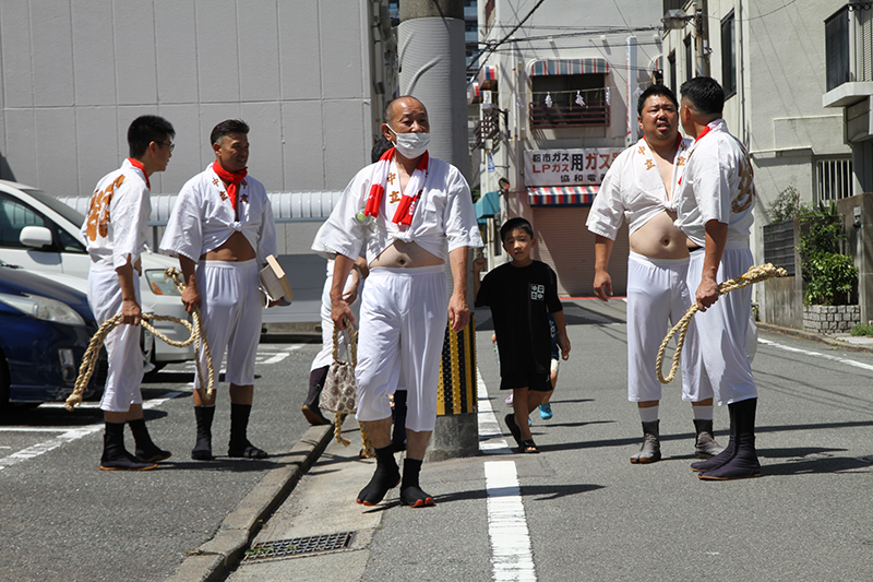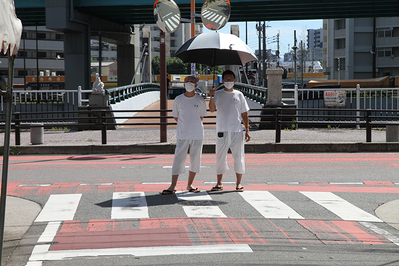 とにかく暑い! 福岡市中央区の観測値では35.0度まで上がったそうで、棒締めの現場には大きな扇風機や、炎天下の空の下で交通警備をしている男達には日傘が渡され、熱中症対策に気が配られていました。