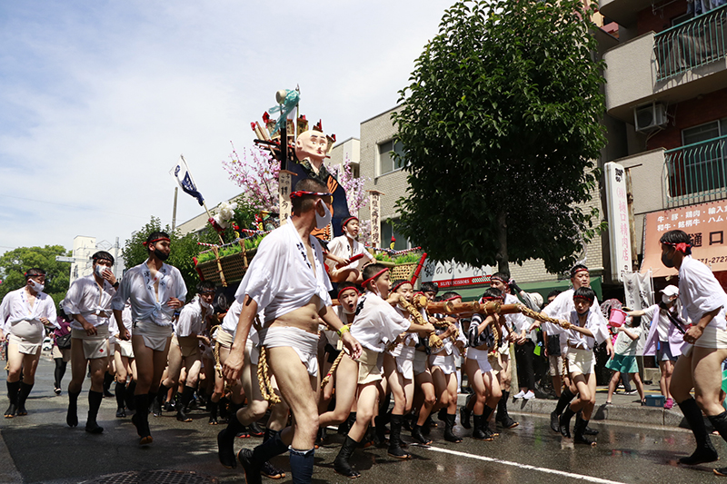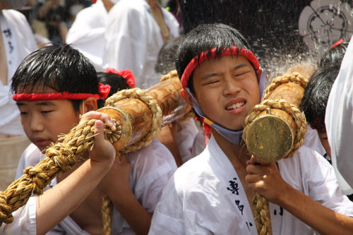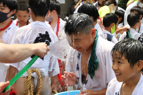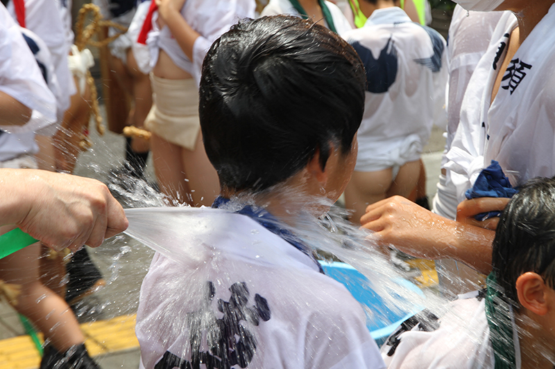 前述の通り、本日は正午の時点で35度まで気温が上がり、大変暑い一日となった博多の町。山笠にはたっぷり水が掛けられ、山舁きに参加する子供にもたっぷり水が掛けられます。涼を求め子供達は先生たちに「もっとかけて!」とせがみ、水をざぶざぶ掛けられるたびに大騒ぎです。