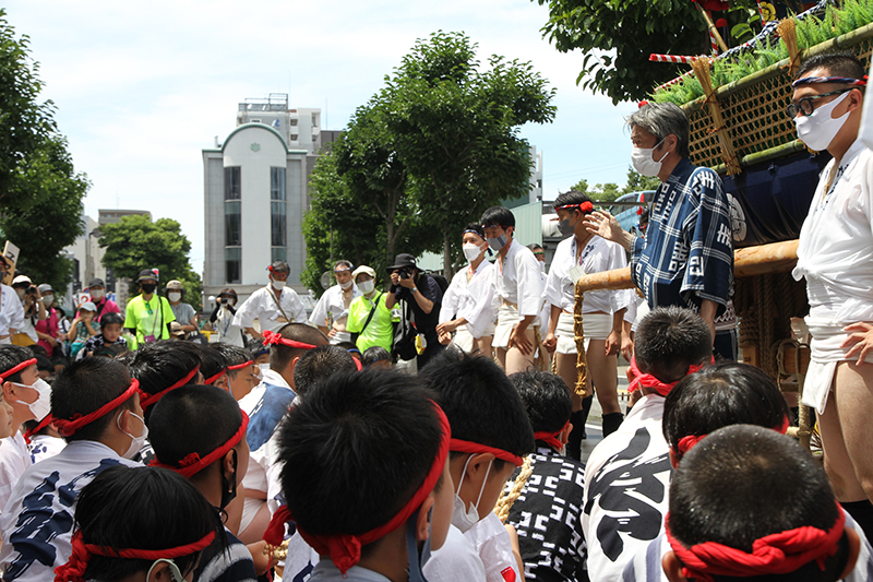 舁き出し前に子供山笠世話人である河原さんが挨拶を行いました。「今日山舁きした後、反省点が見つかったら明日の山舁きにつなげましょう。怪我なく山舁きを楽しんでください」と語ると、元気のいい返事が返ってきました。