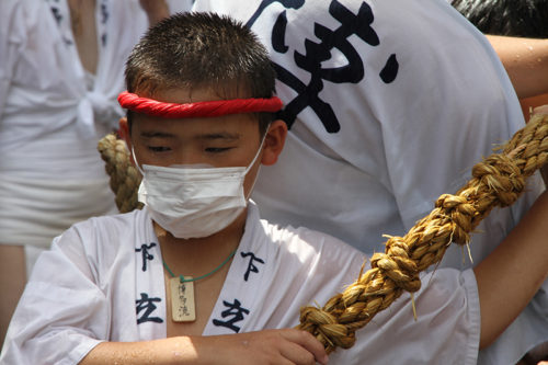 舁き出し3分前。台上がりした子供や舁き手の子供達に水が掛けられ、子供たちの表情に緊張感がにじみでます。