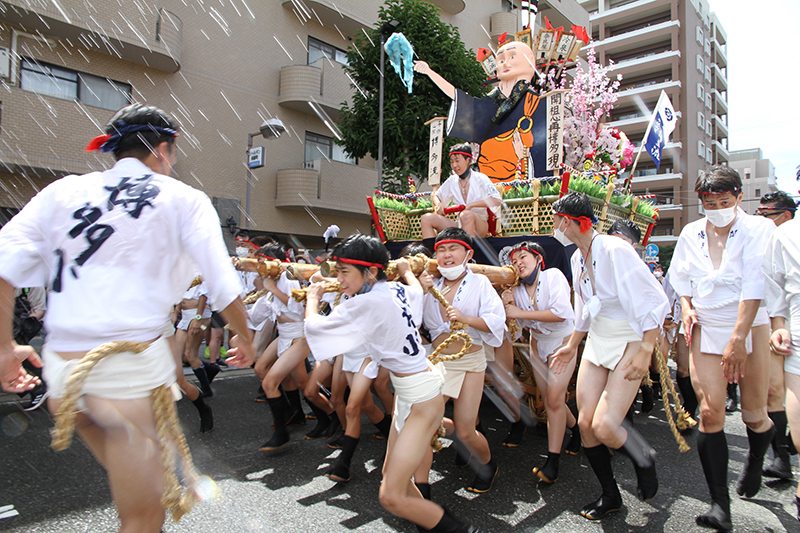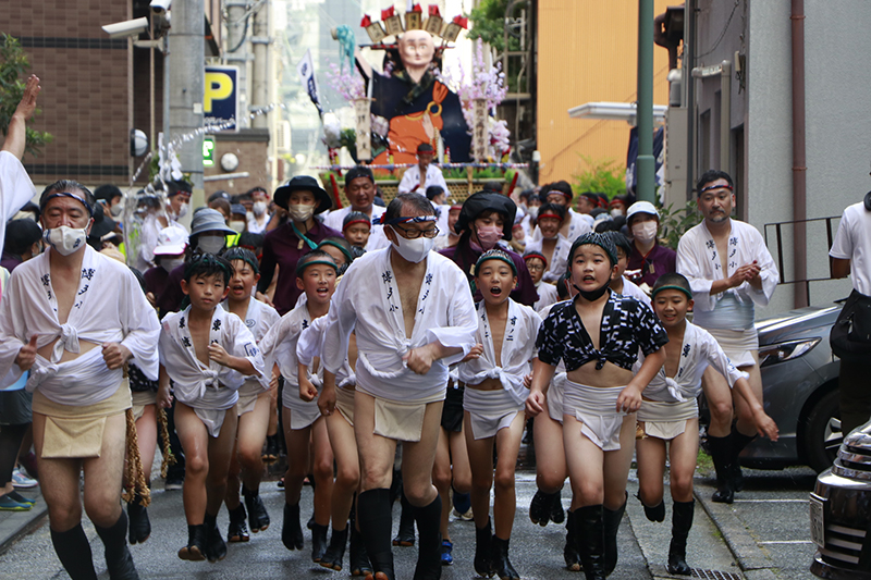 コロナ禍に苦しんだこの二年間を自分たちが清め祓うんだとばかりに、元気よく山舁きを行う子供達。そして山笠に載せられた聖一国師の人形が撒くかのように、沿道からは子供達に大量の水が振り撒かれ、博多の町を祓い清めまわります。