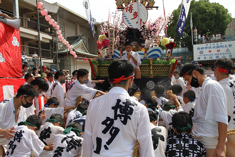 子供山笠は、櫛田神社に舁き入れます。櫛田神社の周辺に集った参拝客や見物客も子供山笠に拍手と応援を送ります。
