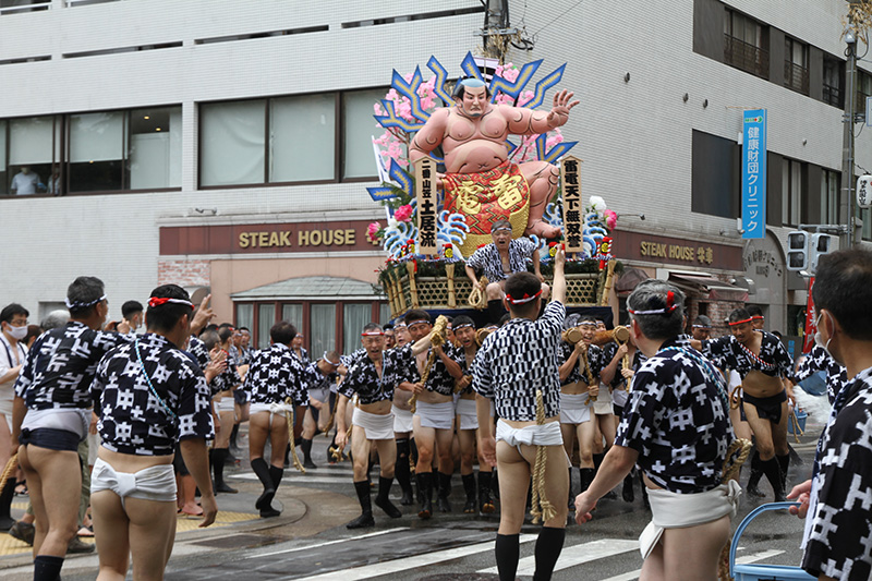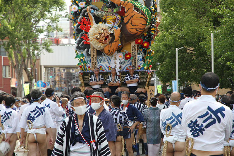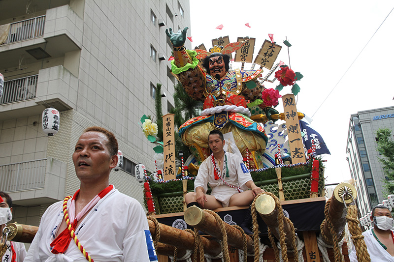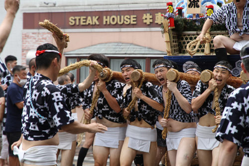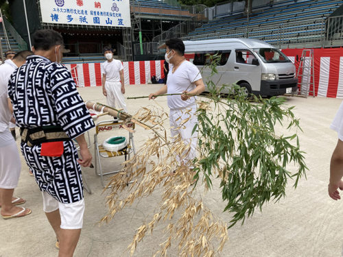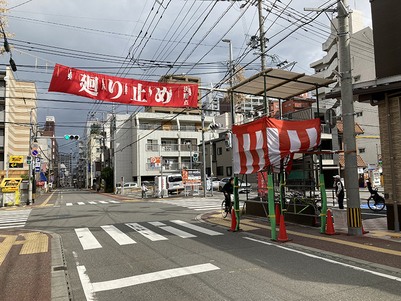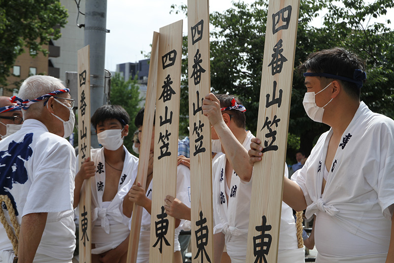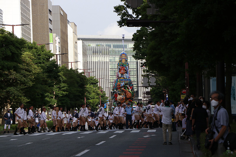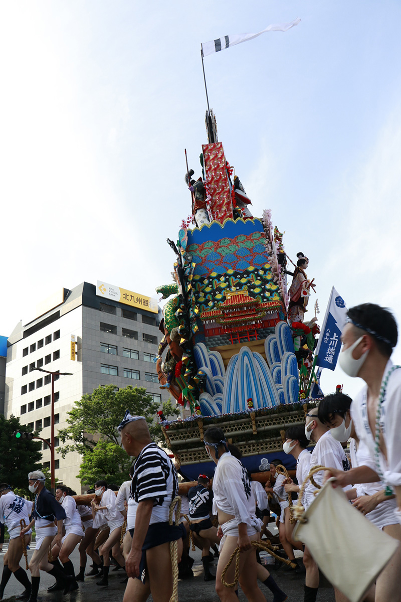 今年は感染防止対策として、舁き手の密集化を避けるために、例年よりも舁き山と舁き山の間を大きく取っており、七番山笠 千代流の山据えの場所は土居通りの明治通り交差点付近となっています。
