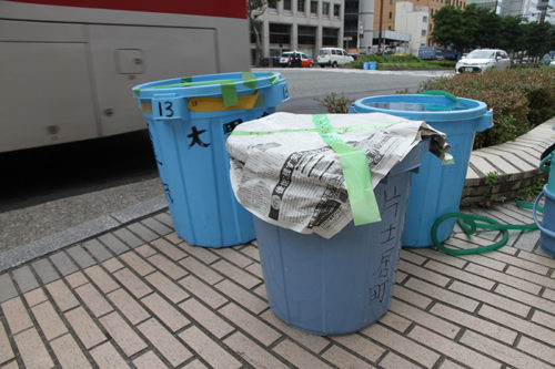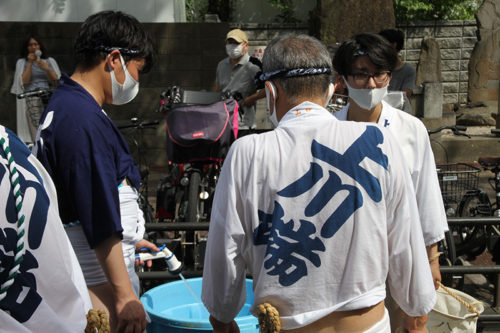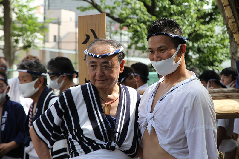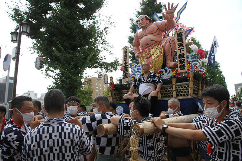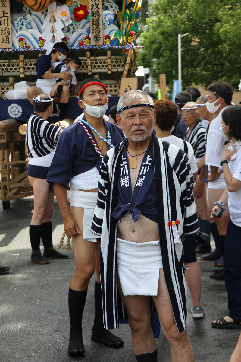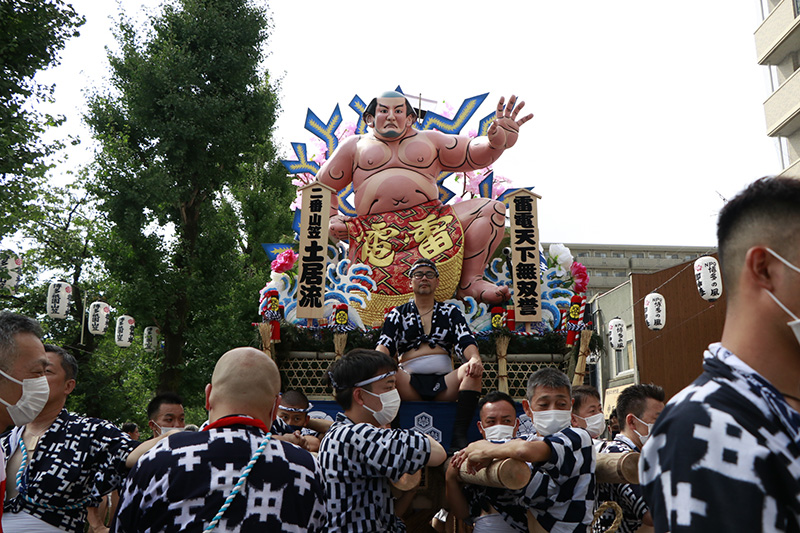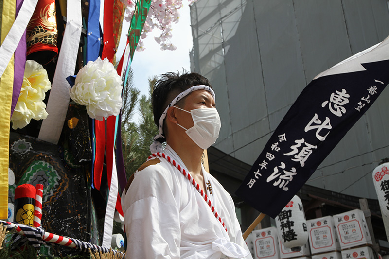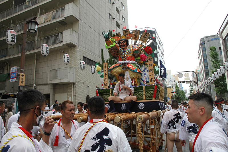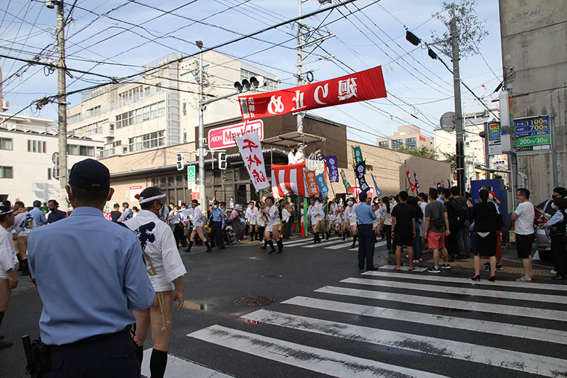 今年は感染防止対策として、舁き手の密集化を避けるために、例年よりも舁き山と舁き山の間を大きく取っており、七番山笠 千代流の山据えの場所は土居通りの明治通り交差点付近となっています。