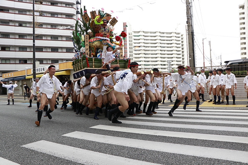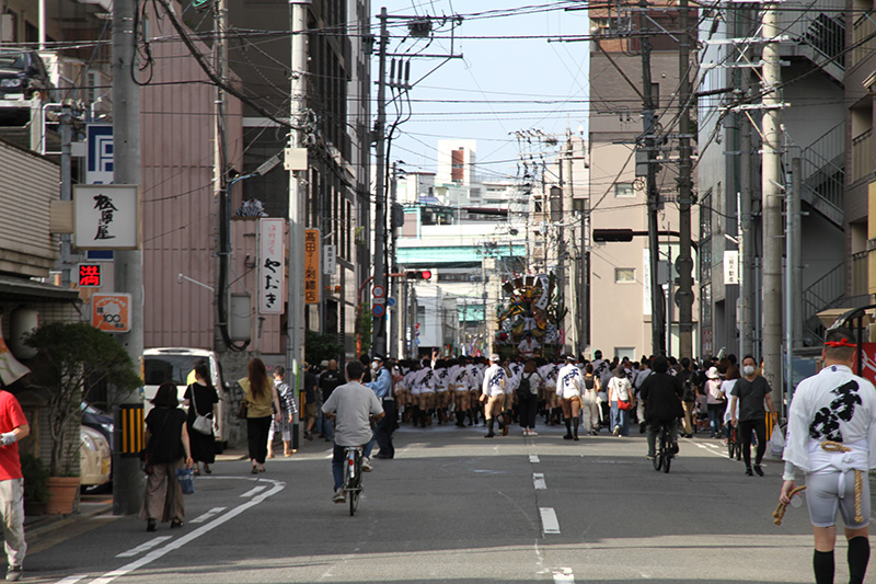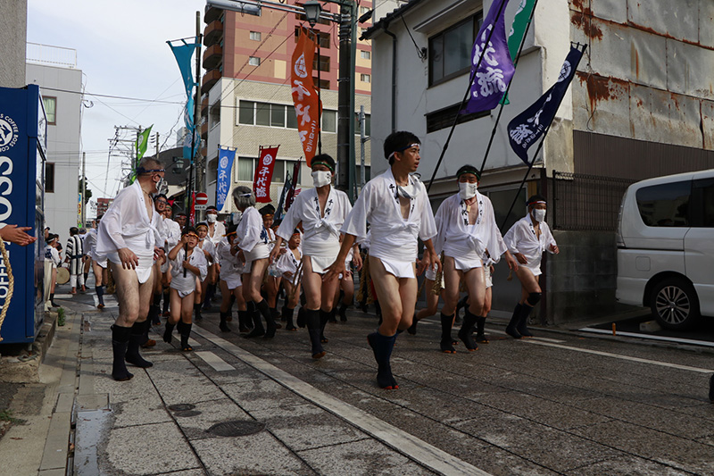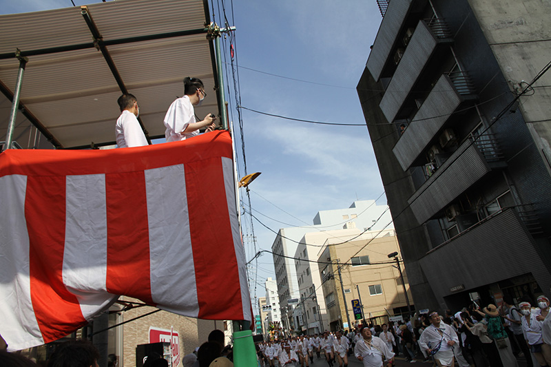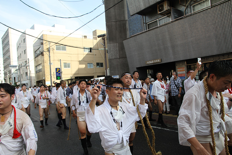 広い大博通りを南下した後は、右折して再び狭い道へ。旧西町筋を北上します。これが追い山ならし最後の直線コースとなります。