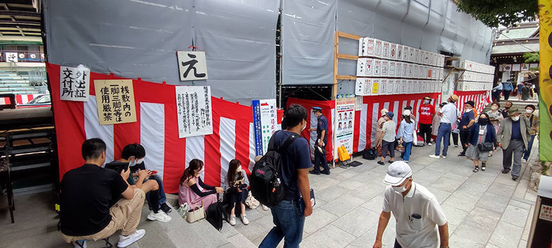 櫛田神社では、お昼が近づくにつれ早くも桟敷席の席取りの列が作られ始め、3年ぶりに行われる追い山ならしを楽しみにしていた人たちが集まってきます。