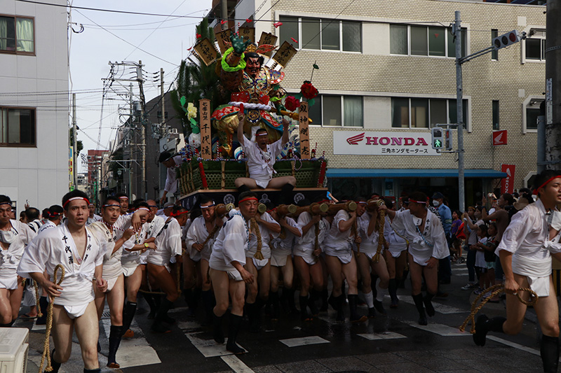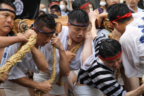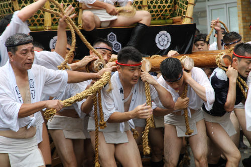 勢水処を抜けると、西流の山小屋に見えるのは追い山ならしのゴール地点である廻り止めの赤い幕が見えてきます。男達は最後の力を振り絞って山を舁いてきます。