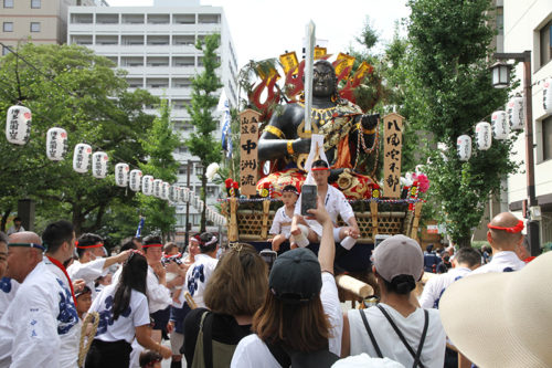 そして、冷泉公園横には八番山笠 上川端通が。二段目・三段目の部分を伸ばし、二引の旗を立てたいわば”完全体”。悠然と据えられたその姿は、人々の目を奪います