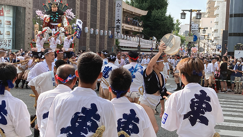 七流が櫛田入りを終えた後に櫛田入りを行った八番山笠上川端通が、巨体を揺らしながら大博通りに登場。人々のどよめきを浴びながら二引の旗を気持ちよくなびかせて人力のみで担がれて進んでいきます。