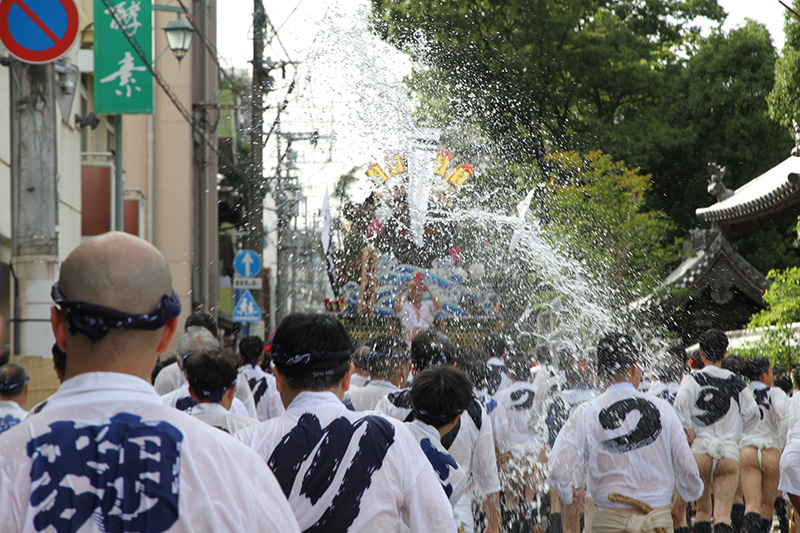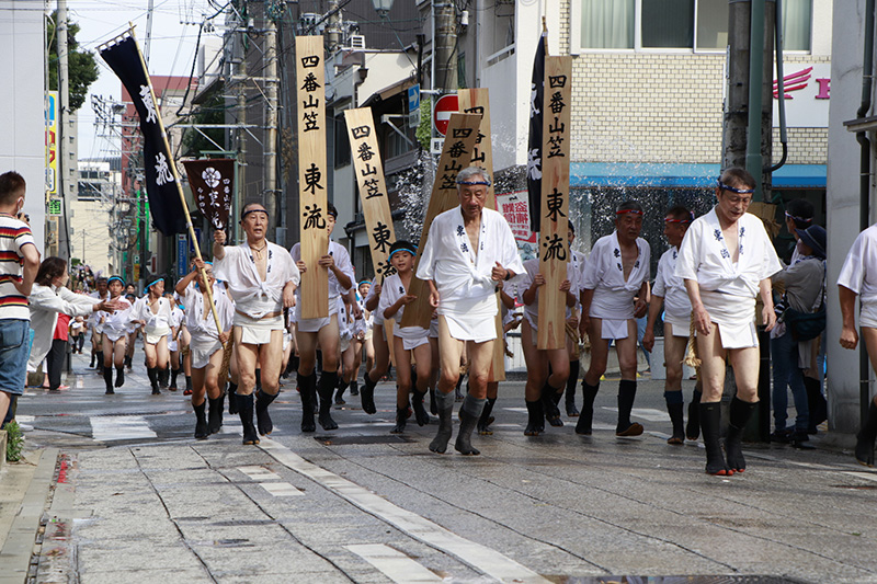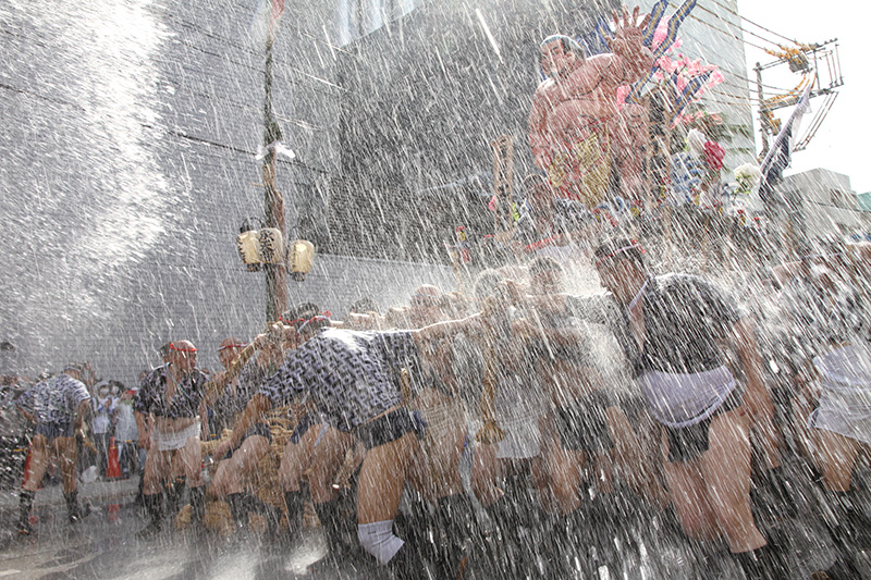 旧西町筋の名所「勢水処(きおいみずどころ)」。左手にあった修験道の寺院「宝照院」は大きな水桶があって大量の勢水が舁き手に掛けられていた名所でもありました。しかし2021年に老朽化により太宰府に”里帰り”し無くなってしまいましたが、付近の方々の力によりたくさんの水バケツが並び、舁き手達には2年のブランクを感じさせないような大量の勢水が浴びせ掛けられ、まさに「勢水処」の所以を示します。
