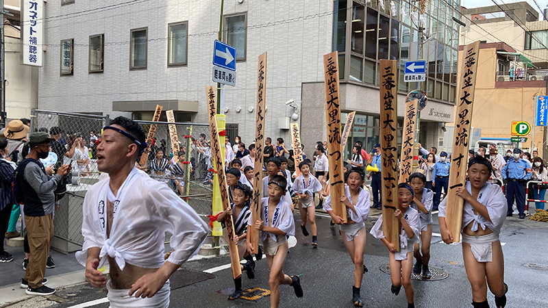 恵比須流が舁き出した後、二番山笠以降の流も5分おきにスタートし、博多の町へ飛び出していきます。