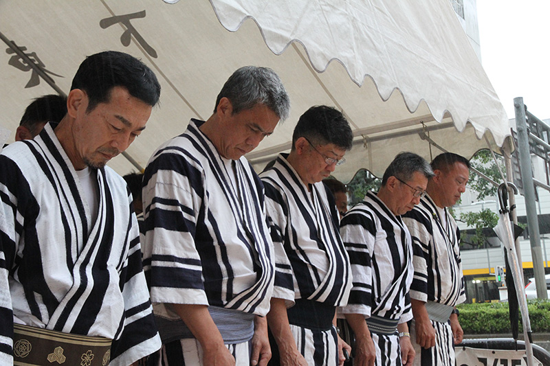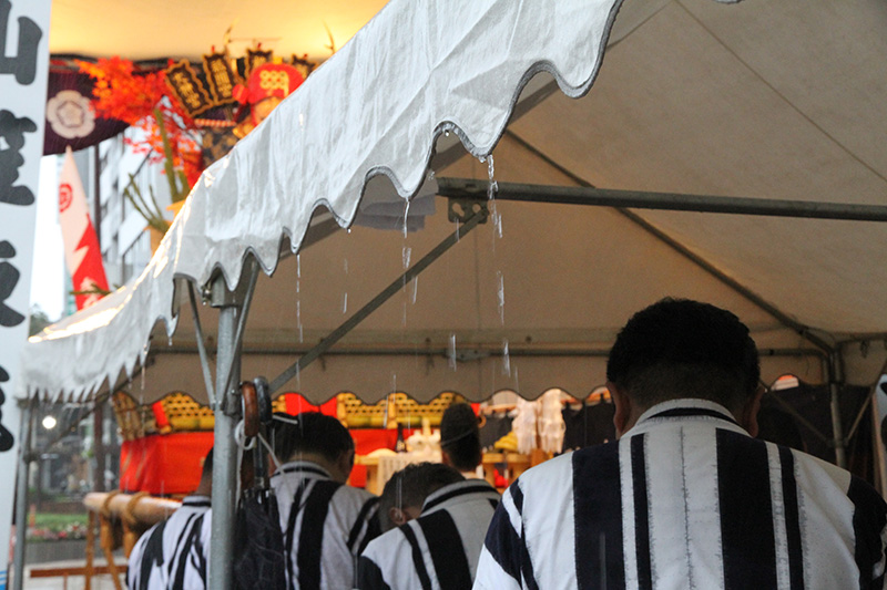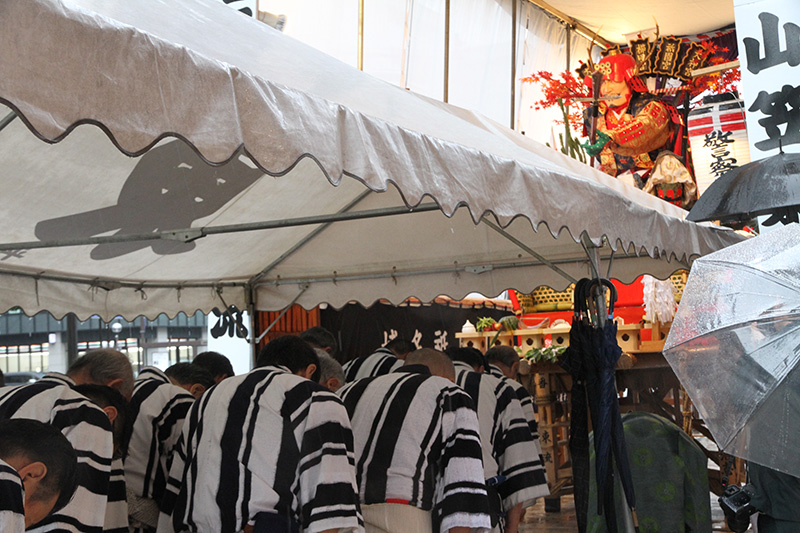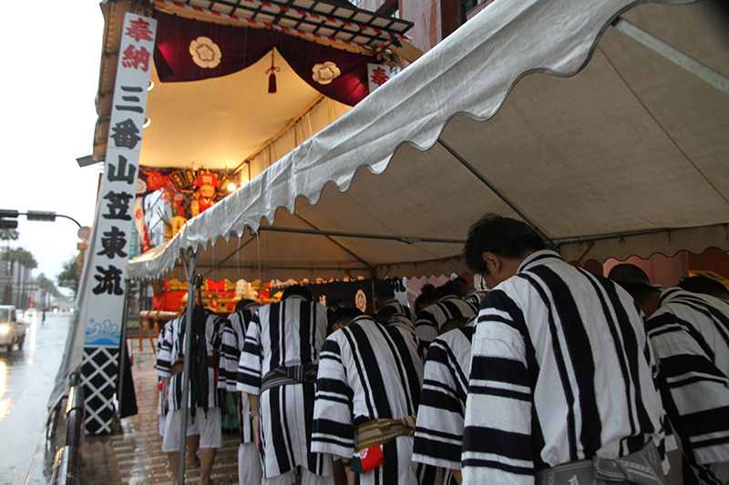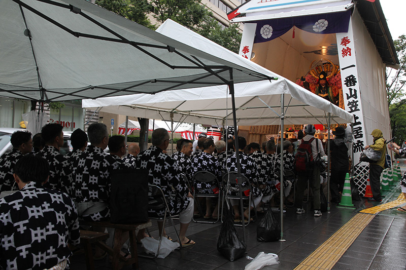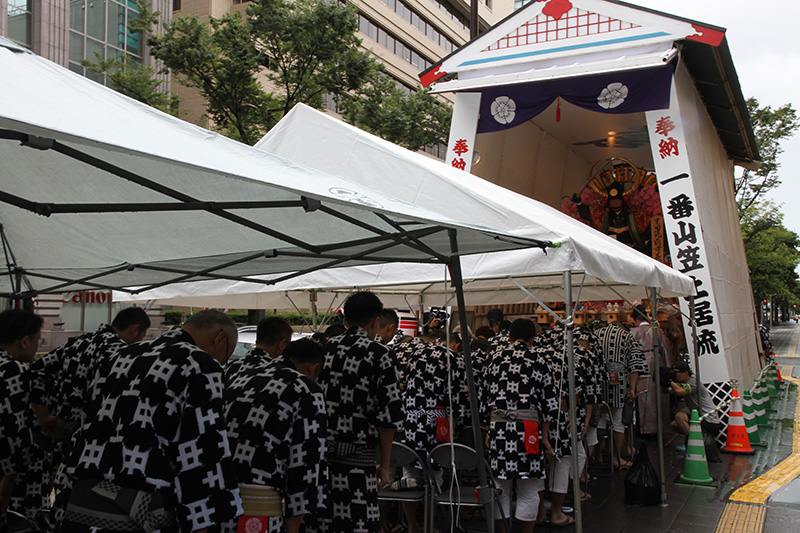 そして今年の一番山笠土居流も、まだ雨が降り続く中、明治通り沿いの山小屋前にて、午前10時より御神入れを執り行いました。