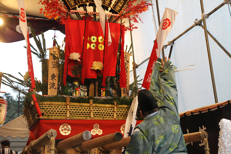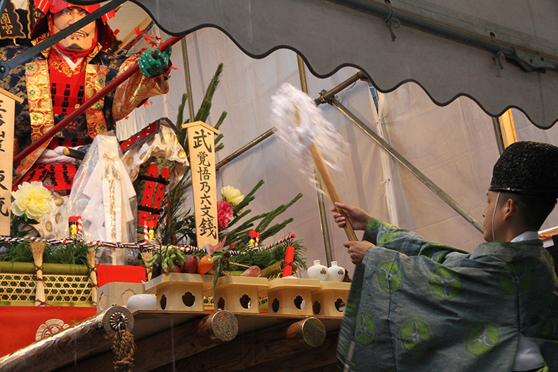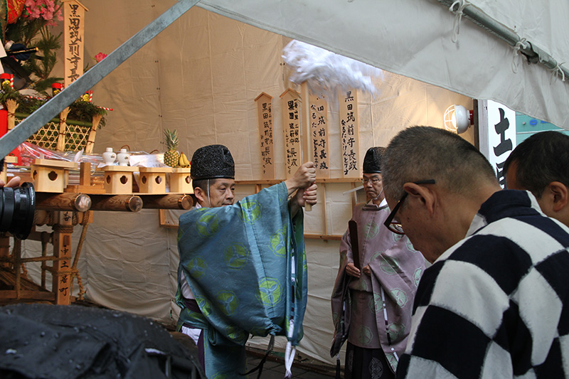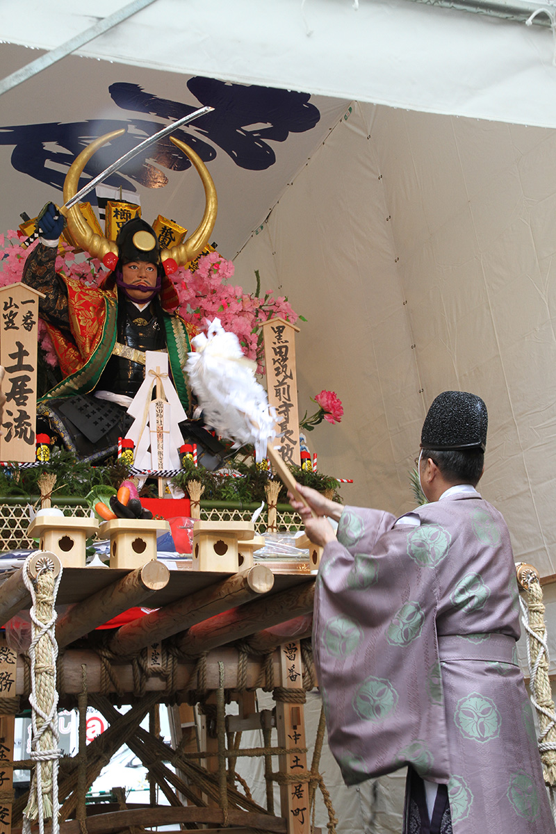 浄め祓いの儀では、神職が舁き山笠の表と見送りを大幣を振って祓い清め、神を舁き山の中に込めました。