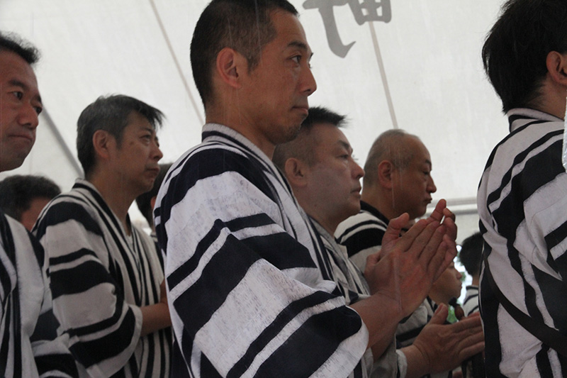 山小屋前に設営されたテントの下で、神事参加者は櫛田神社の神職のお祓いを受け、雨がテントの屋根を叩く音の中、祝詞に耳を傾けます。