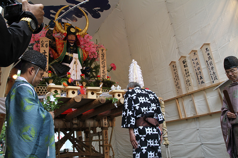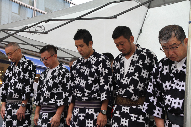玉串奉奠では、金子総務や中村弘峰人形師が玉ぐしを捧げ、追い山まで元気に怪我無く無事奉納ができることを祈願。最後に金子総務に奉納目録が櫛田神社より授与されました。