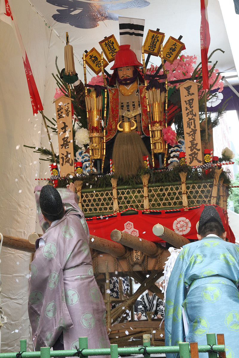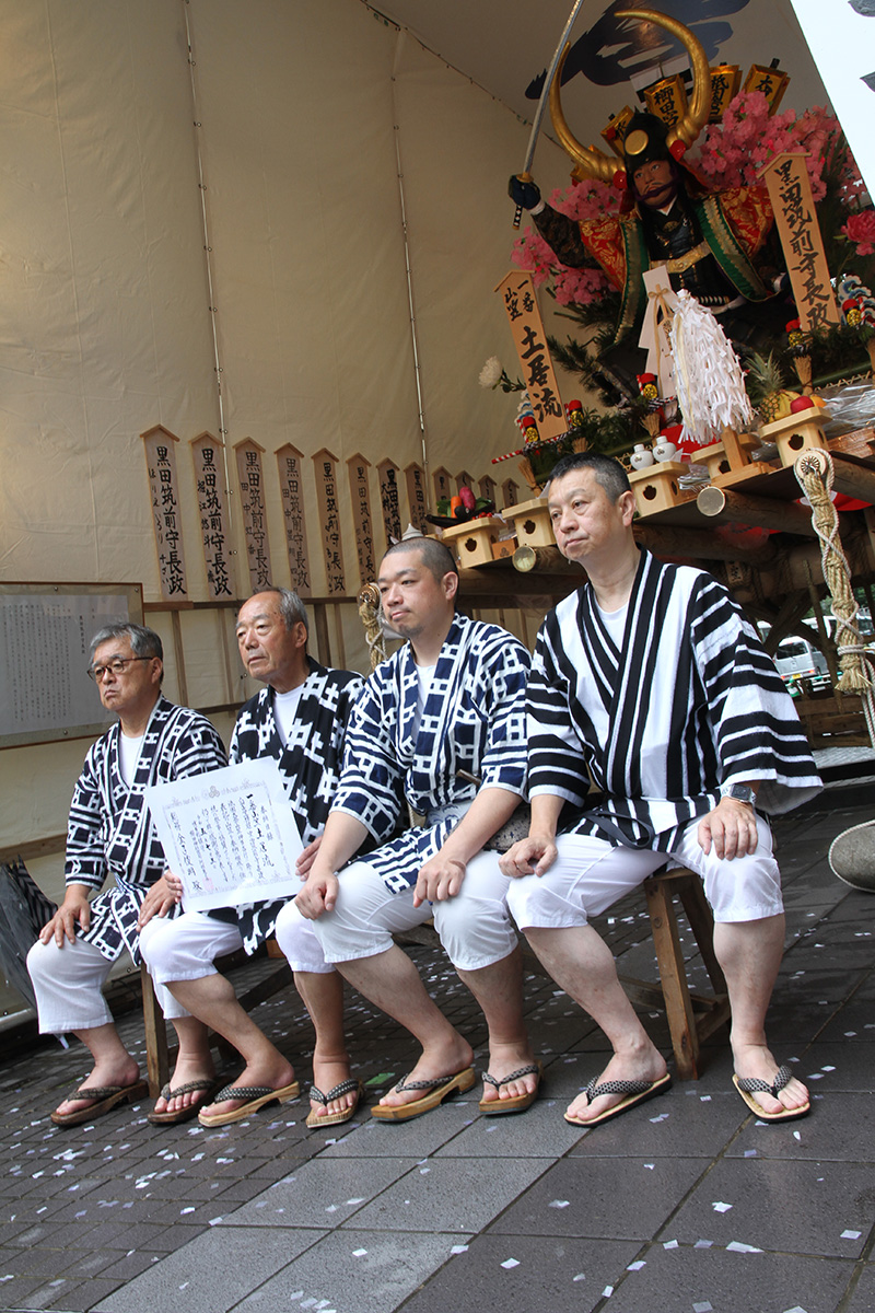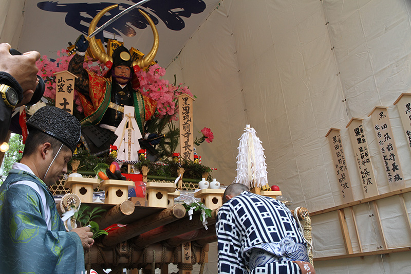 今年は一番山という事で「気合が入っている」と話していた人形制作を担当した中村弘峰人形師。なんと当番町には秘密で見送りにも表と同じサイズの人形を作り上げ、黒田長政と黒田官兵衛の親子を背中合わせに飾り付けました。そして、昨日の飾り付けの際に初めて黒田親子の人形を披露。シートを外した瞬間、その場にいた全員がどよめき喝采をあげました。