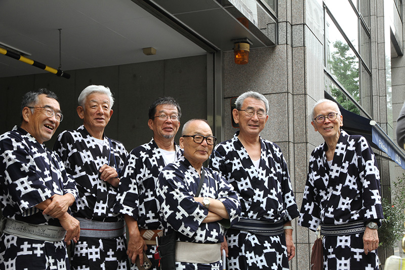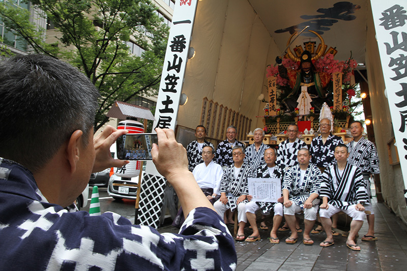 神事が終わると、降り続いていた雨が止み、男たちの顔から無事ここまで来たという安堵と喜びの笑顔が。晴れやかな顔で記念撮影に臨みました。
