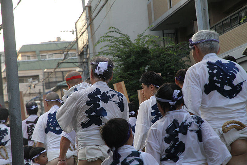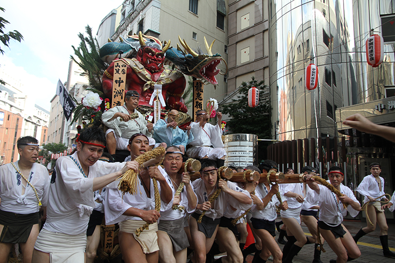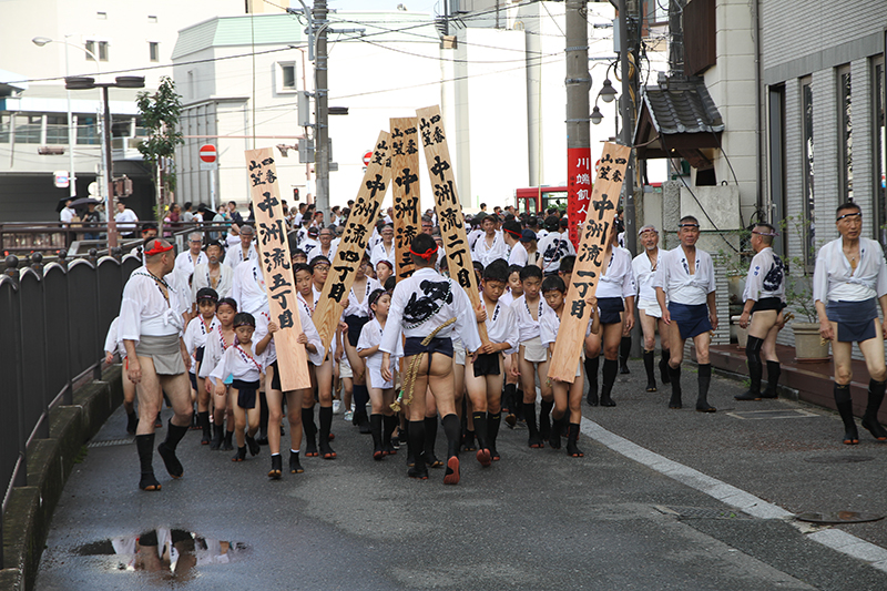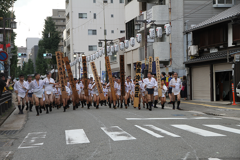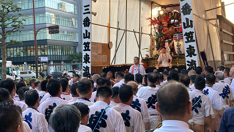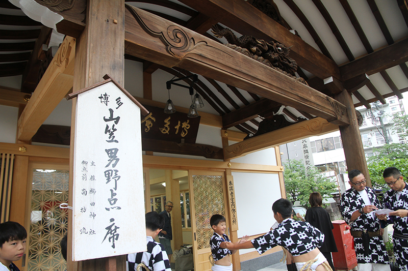中洲流の10日の流舁きでは、子供を乗せて走る祝儀山を行い、この一年間に亡くなった山笠の功労者を悼む追善山も行います。祭壇が飾られた場所で山笠の表を向けて祝いめでたを謡いあげ、山笠が好きだった故人を思いながら山笠の流儀で悼みました。