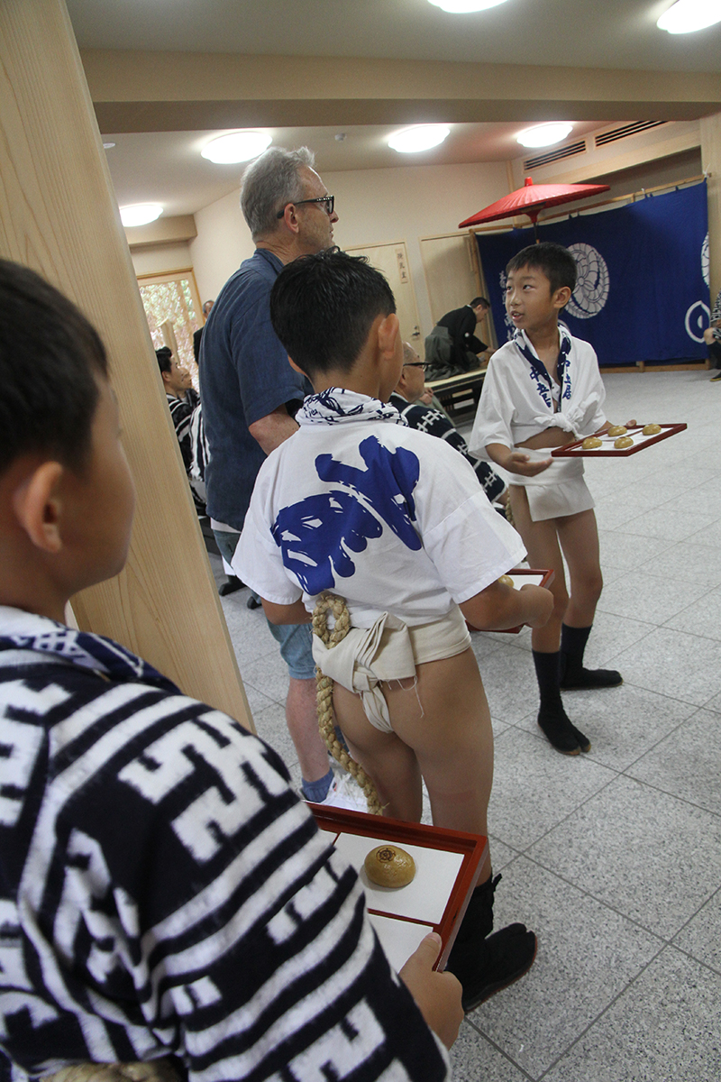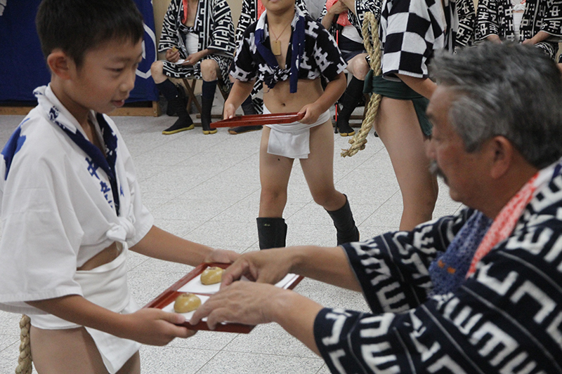 お手伝いをするのは、一番山笠の当番町の子供達。水法被姿で、参加者にお菓子とお茶を運びます。