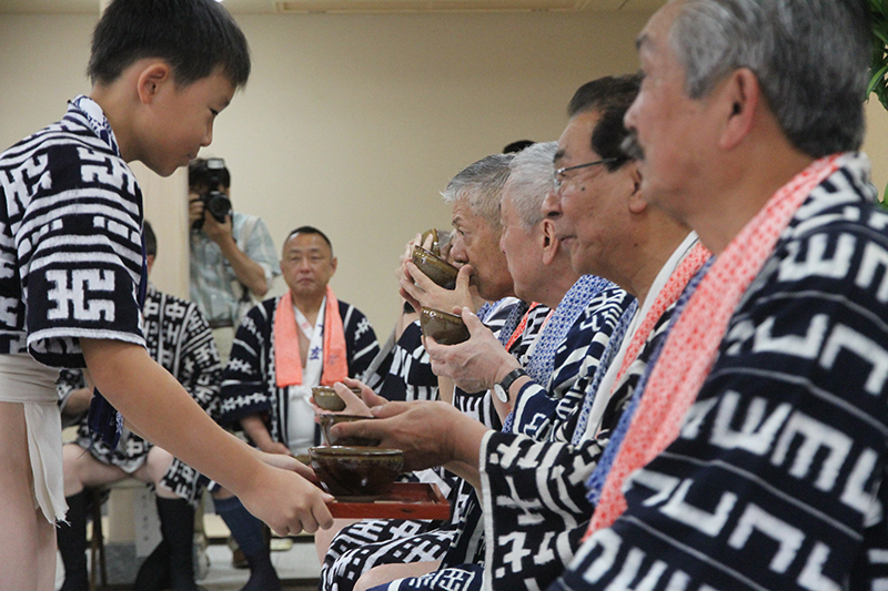 各流れの総務は、流舁き前で高ぶる気持ちを静めるように、お茶をぐいと飲んでこの時間を楽しみました。