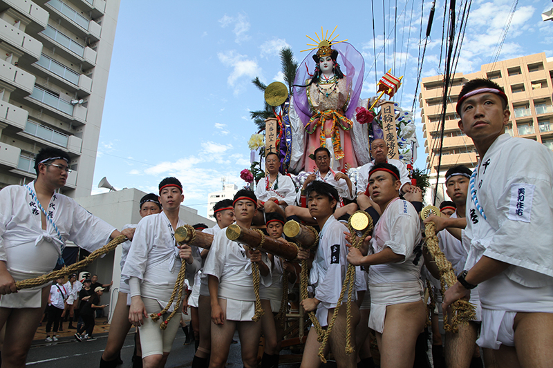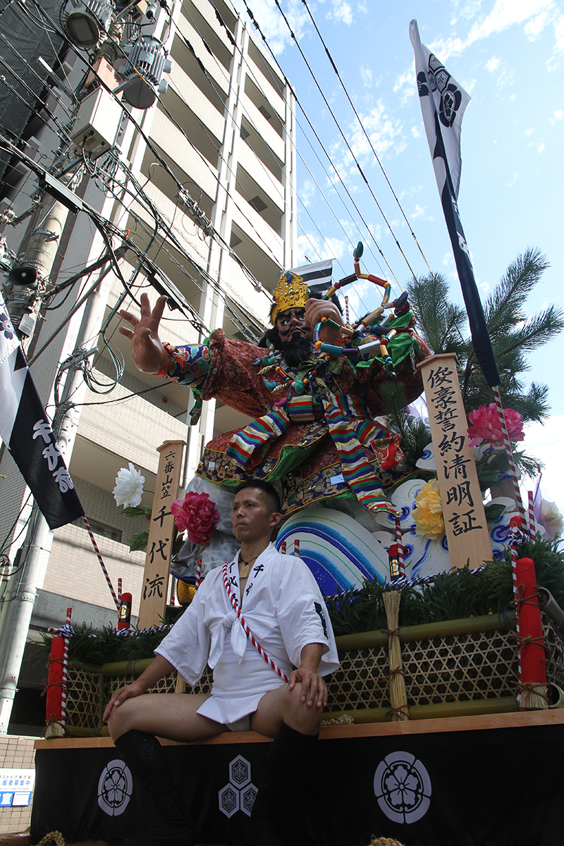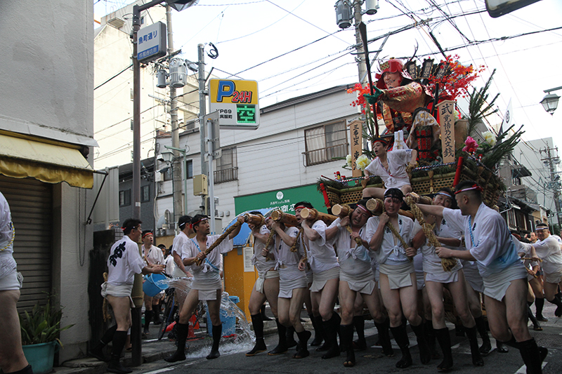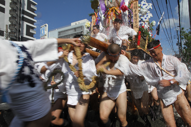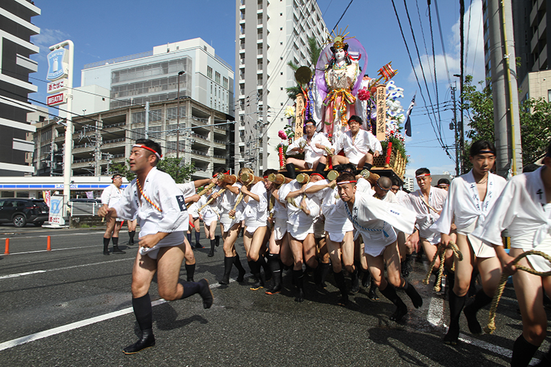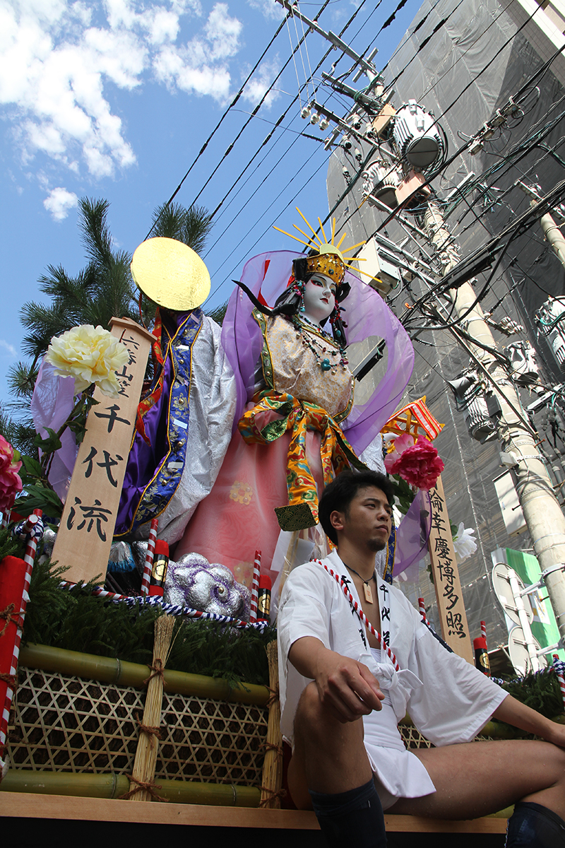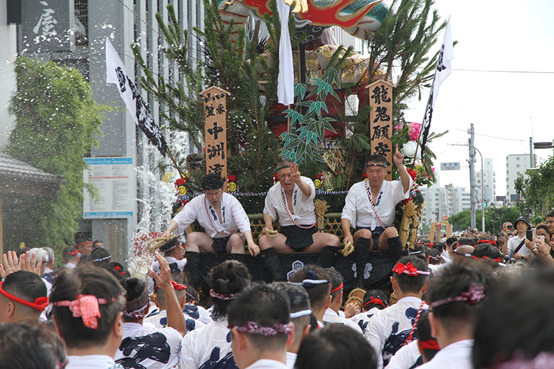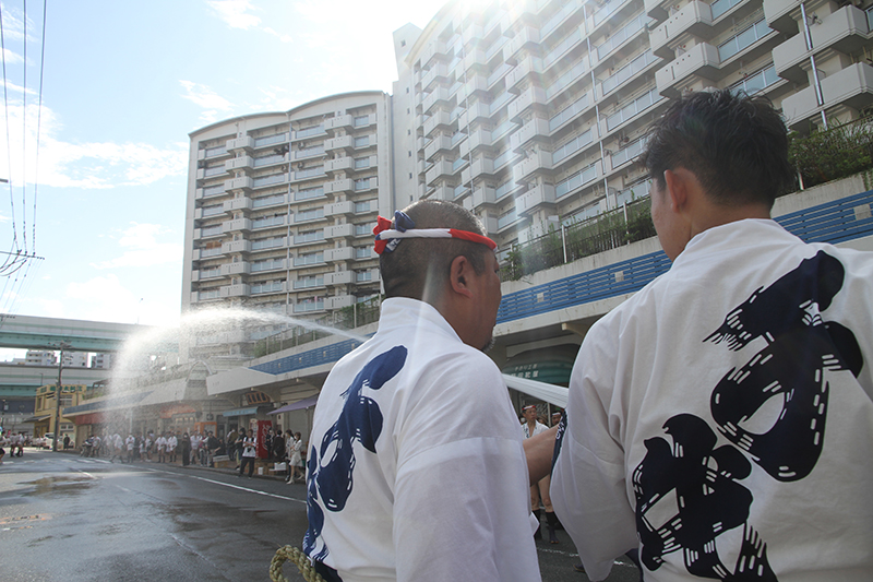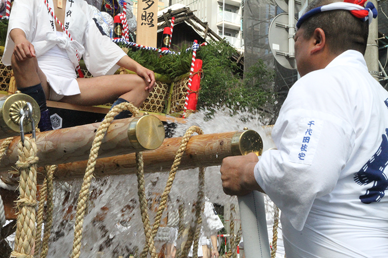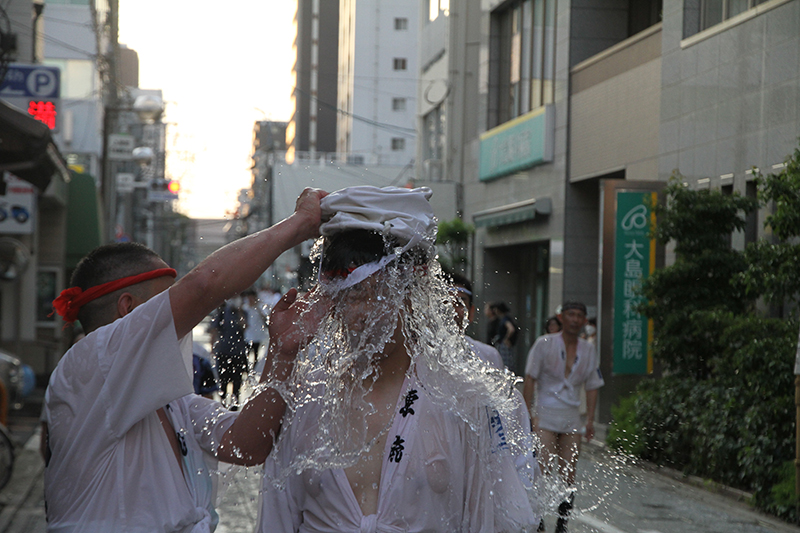 午後4時からは千代流と中洲流が舁き出します。千代流では舁き出し前に、山笠と道路にたっぷりと水が掛けられ準備が進められます。