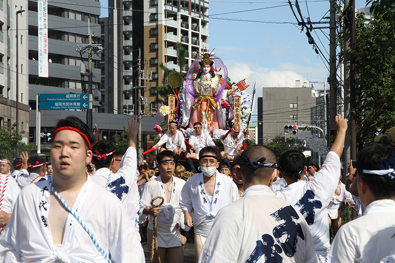 午後3時59分。1分前の時間が告げられると、台上がりした川口総務が祝いめでたを謡いあげ、千代流の舁き山笠が走り出しました。
