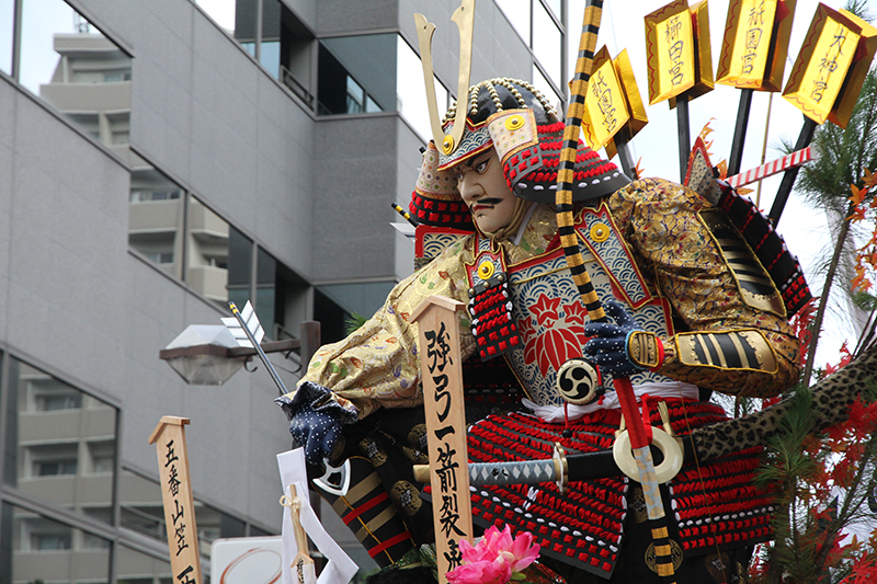 野点は天正15年(1587年)九州征討の折に、吉の命により千利休が千代松原で初めて設営した方式で、 その昔、戦いに臨む武将たちが甲冑をつけたまま、荒ぶる心を静めるために茶を喫したことが今に続いている、博多にとっては歴史的な催し。流舁きを戦と見立てた「出陣」の前のように陣幕を張って行っています。
