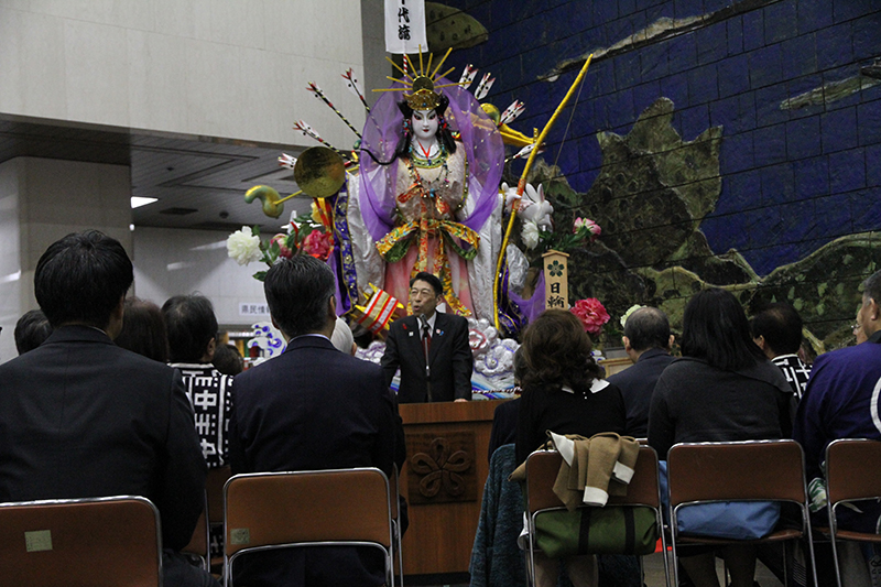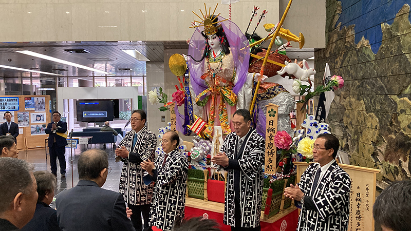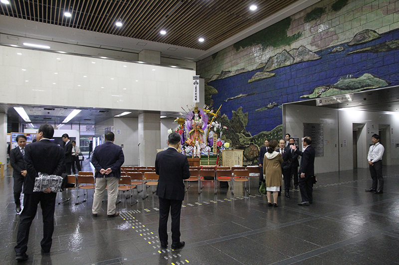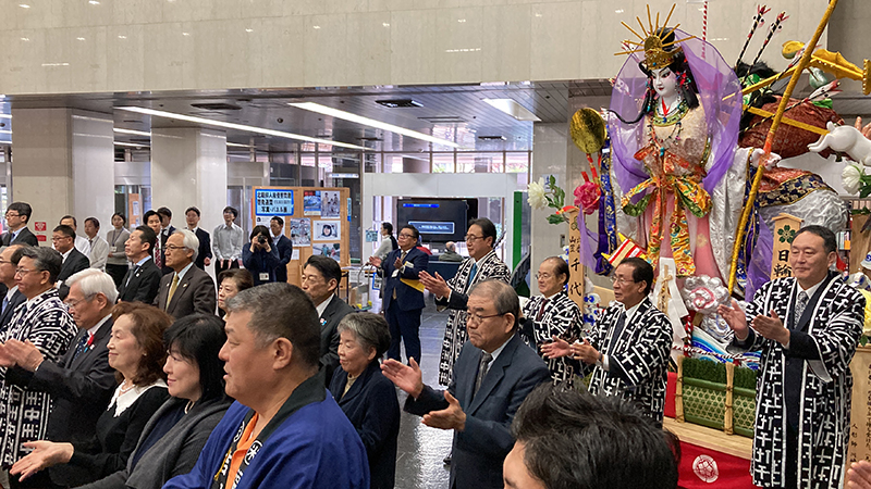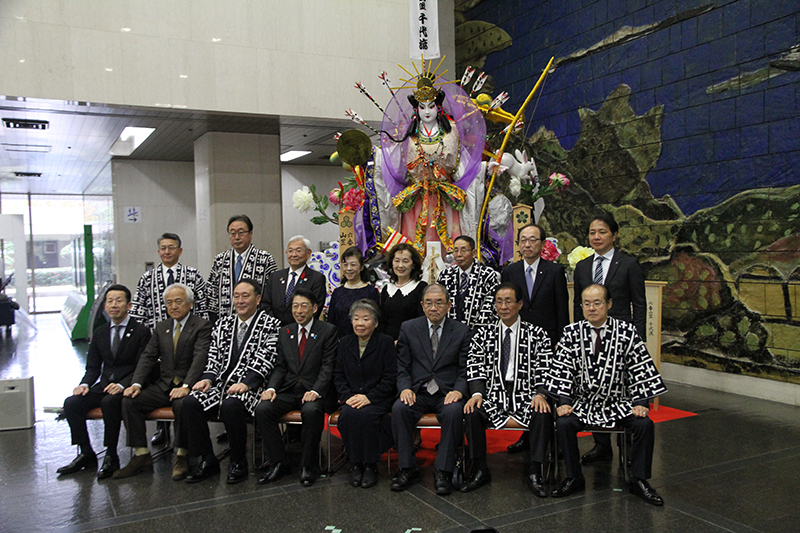 今回の展示にあたり、午前10時よりお披露目式が行われ、服部誠太郎福岡県知事を始め、博多祇園山笠関係者、県議会関係者がお祝いに駆けつけました。