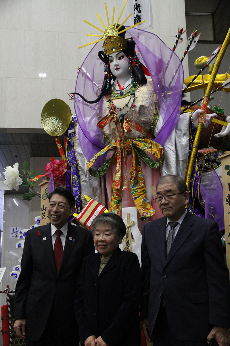 今年の千代流の飾りは、山笠の長い歴史の中で初めて女性人形師が担当したという事もあり、大きな話題になりました。お披露目式には表を担当した川﨑幸子師と、見送りを担当した川﨑修一師も参加しました。
