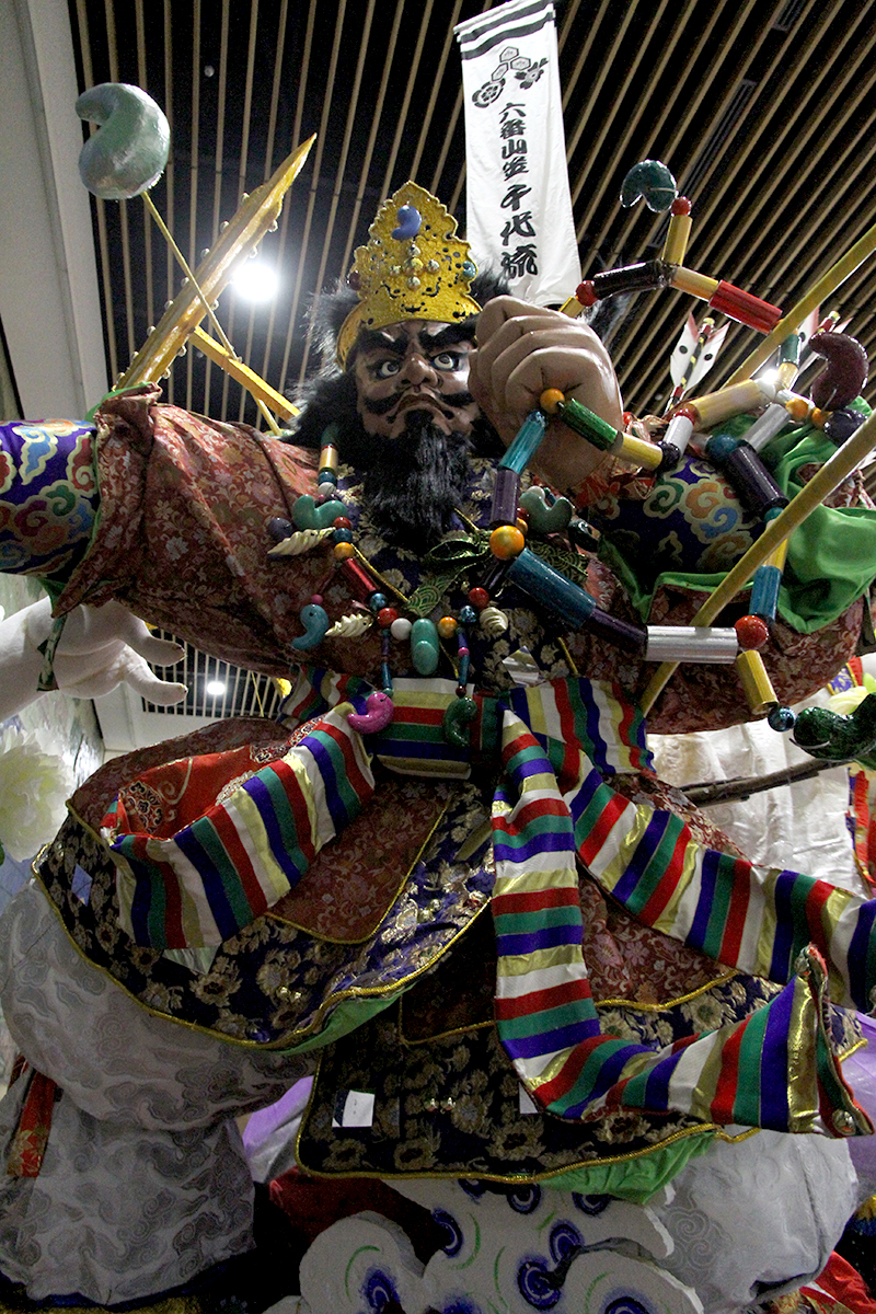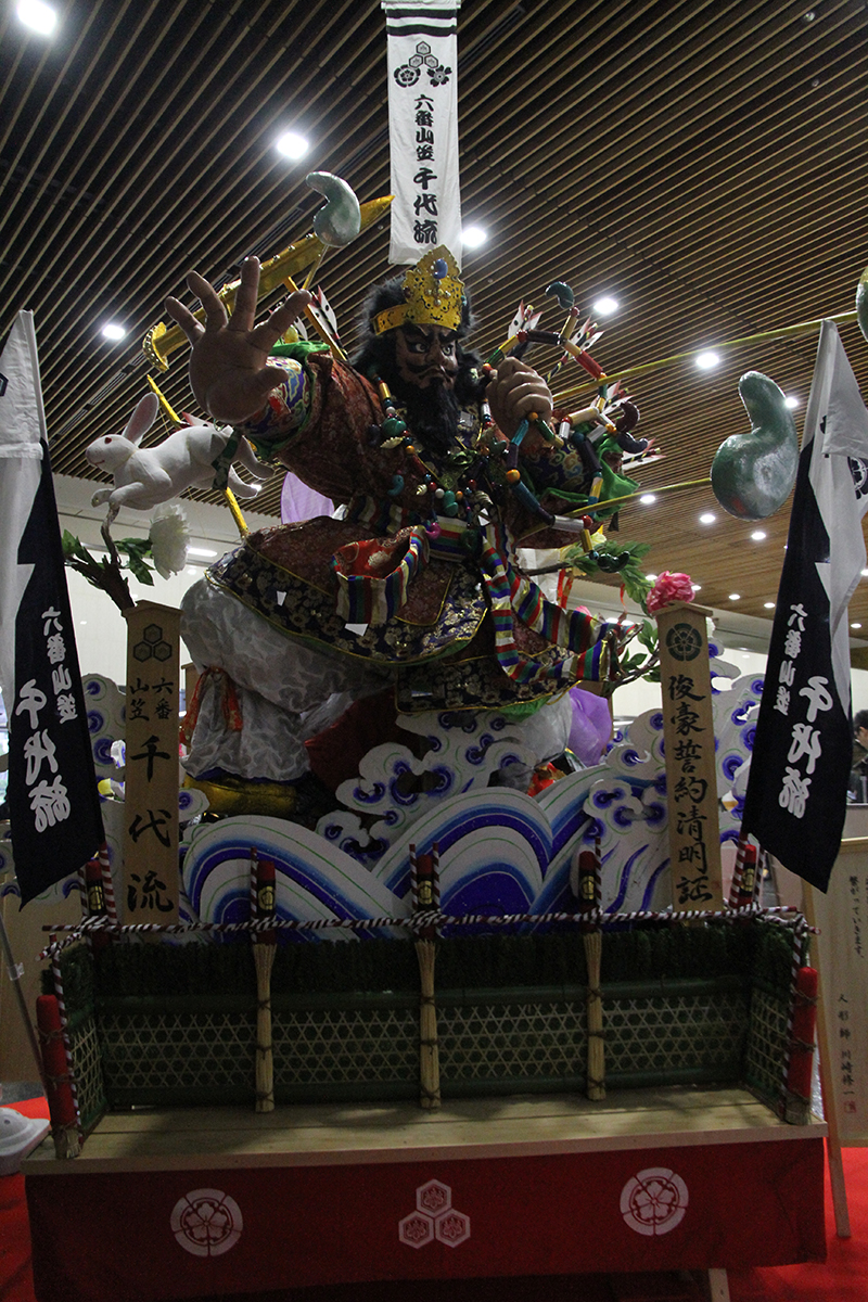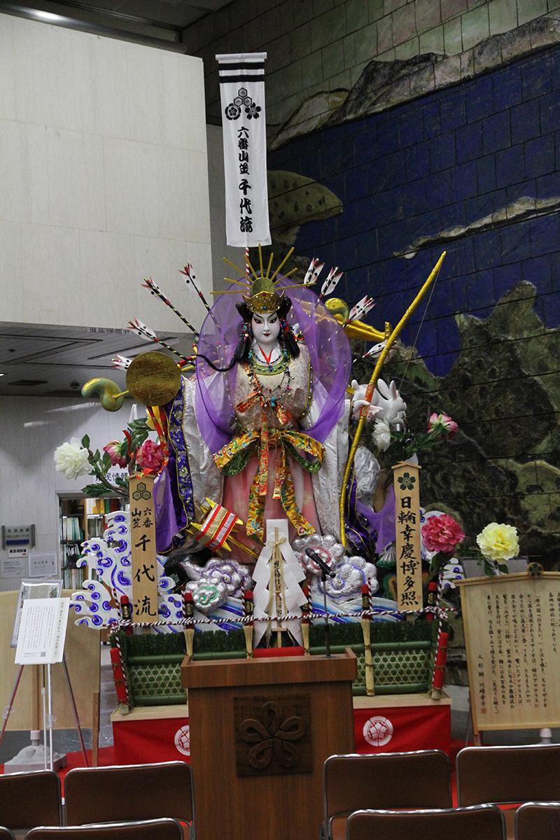 今年の博多祇園山笠で実際に使用された六番山笠 千代流の舁き山笠飾りが、本日12月11日(月)より福岡県庁のロビーにて展示が始まりました。千代流は毎年山笠期間中に県庁に山笠を舁き入れて表敬訪問していますが、祭り後に県庁内に山笠飾りが飾られるのは初めての事です。
