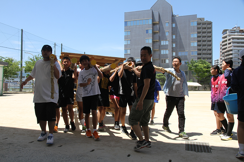 先週作り上げた山笠台を大人たちと生徒たちで職員室横に移動させ、生徒と大人全員で輪を作り飾り付け始まりの会を行います。