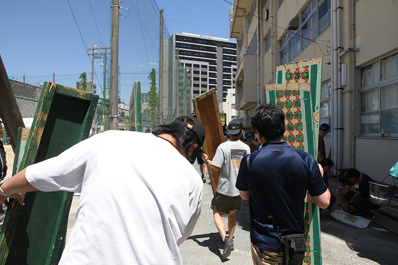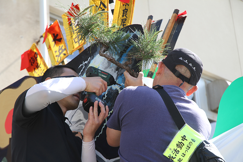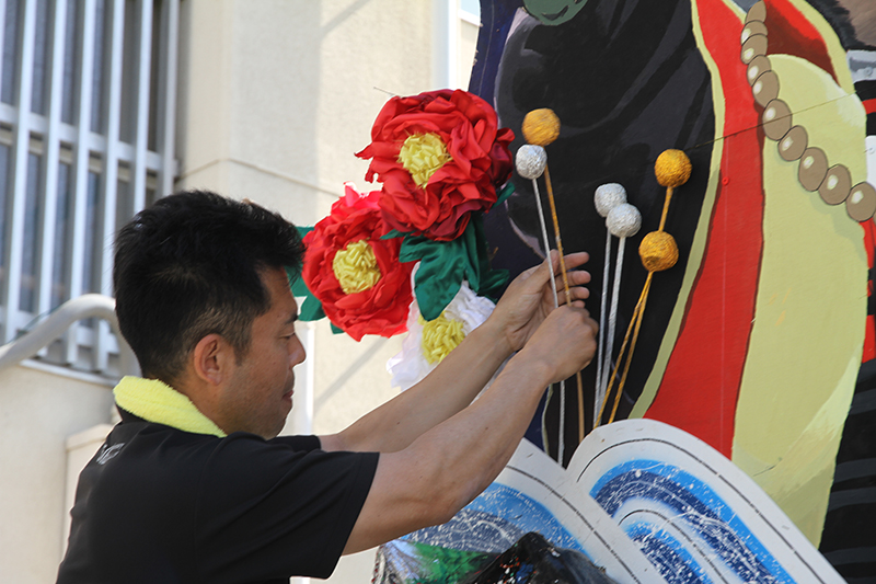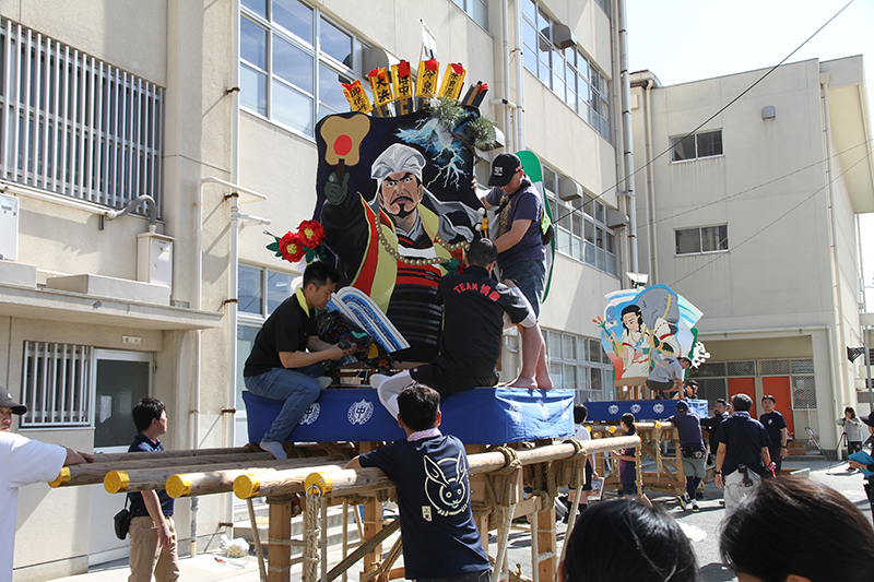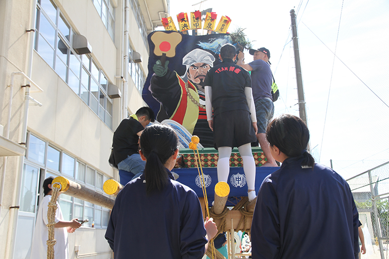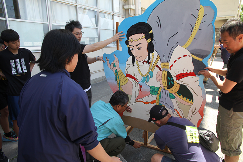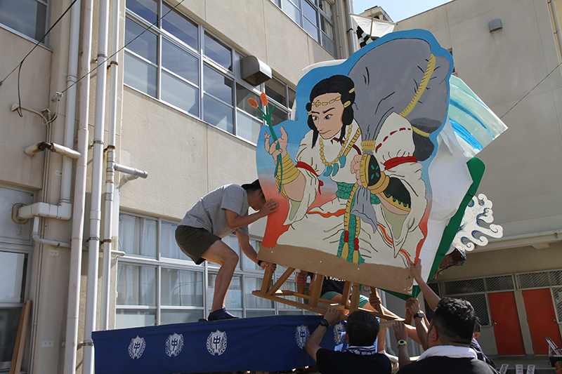 いよいよ飾り付け開始です。骨組みに人形代わりの大きな絵を取り付け「人形師さん! センターはここでいい?」と、女子生徒を「人形師」として敬意を以て扱い、大人の山笠と同じように飾り付けの雰囲気で確認する大人たち。