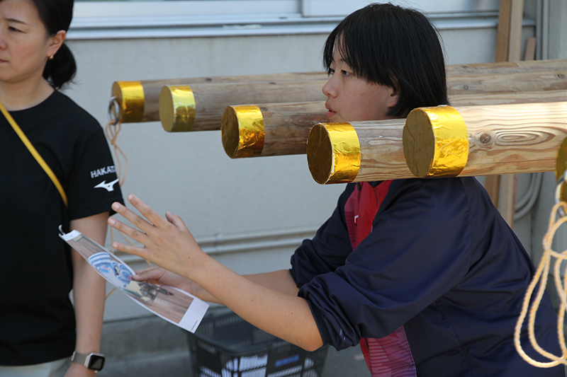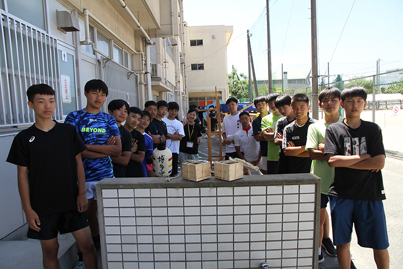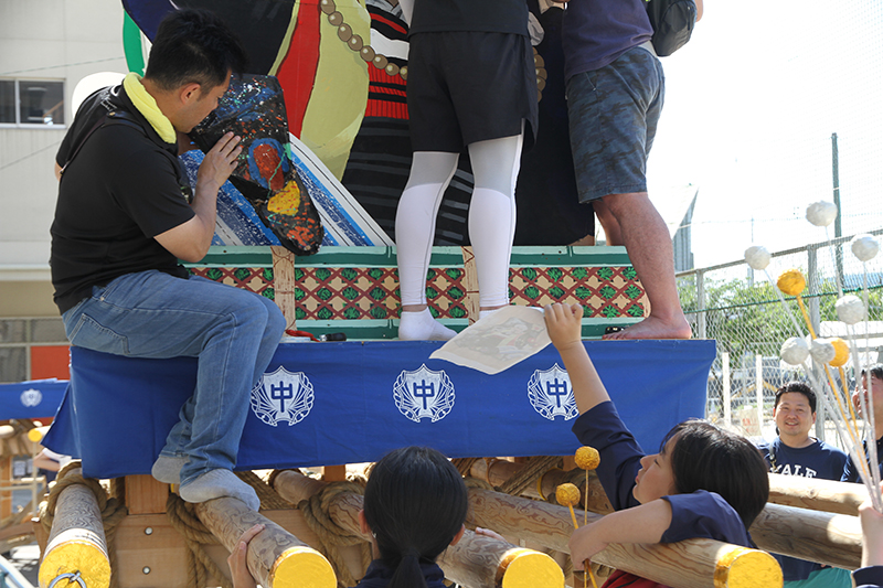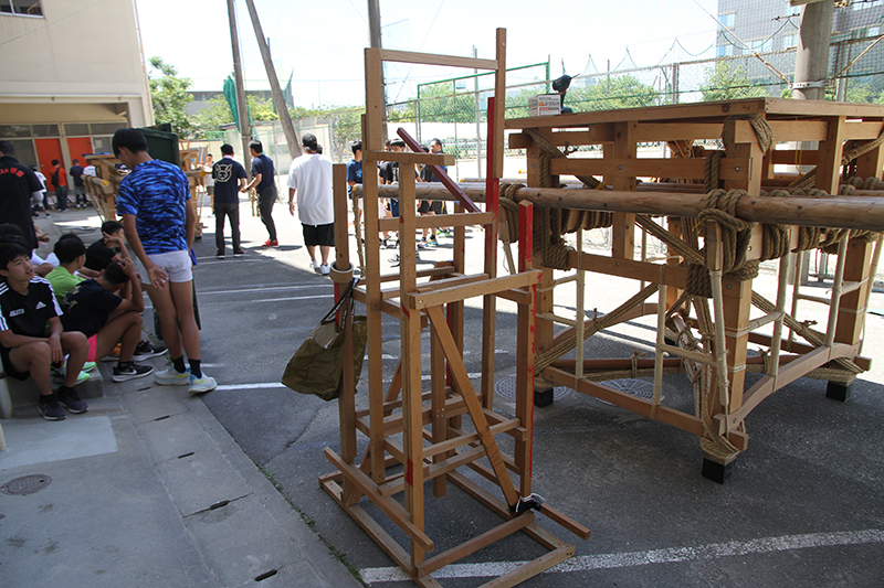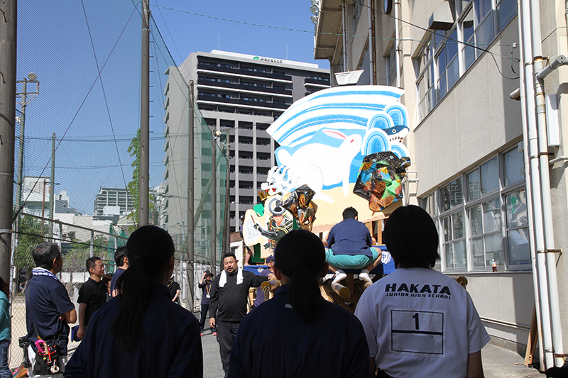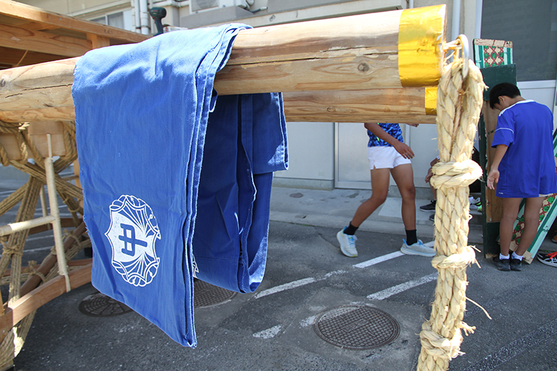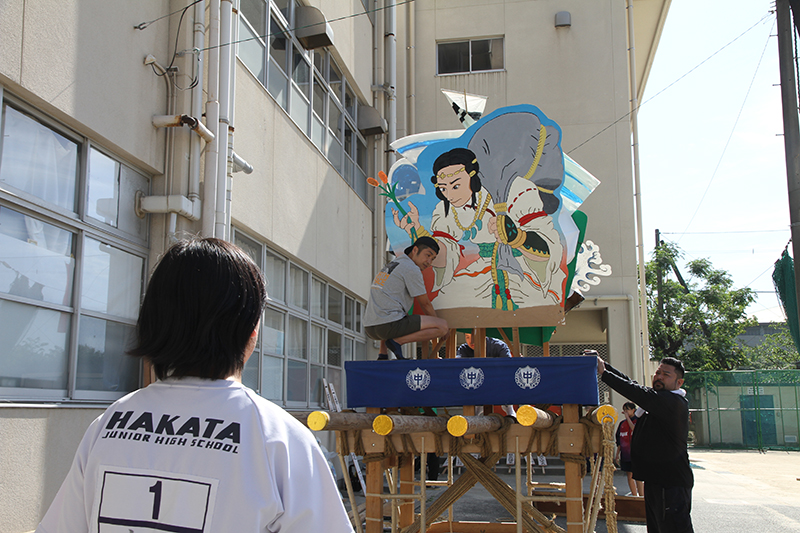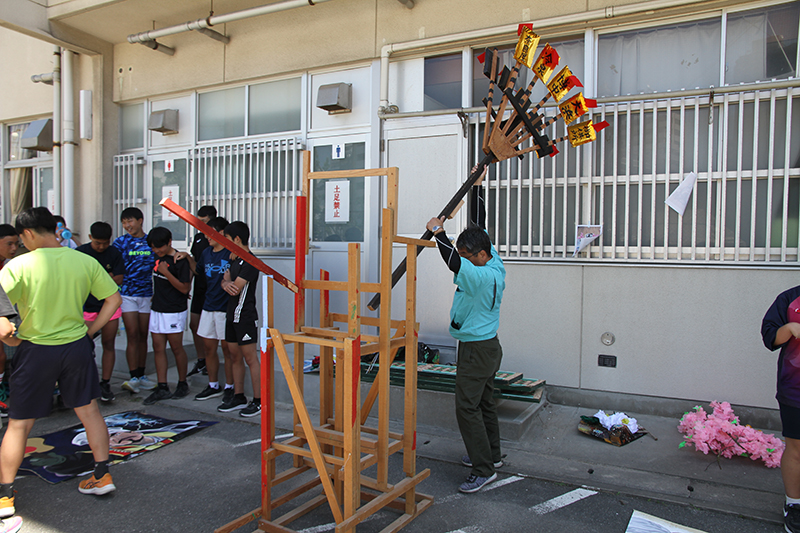 体育祭を明日に控え、博多中学校ではプログラム内で披露する「博中山笠」の飾り付けを行われました。