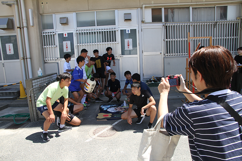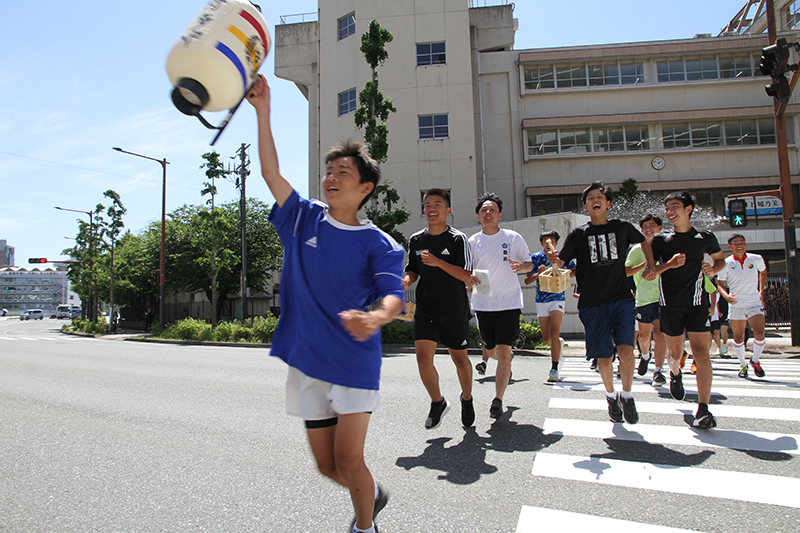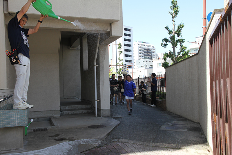 「このままじゃ暑かろう」と笑いながら、走ってくる男子生徒たちに大人たちが”勢い水”を振りかけます。