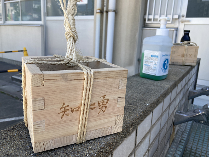 休憩が終ると、皆で少しずつ真砂をすくってお汐井升に入れます。皆でやってきたので皆で清めの砂を詰めます。