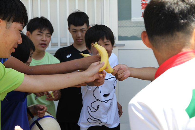 男子生徒はバナナで乾杯。頬張って気勢を上げ、お汐井取りに向けての気合を入れていきます。