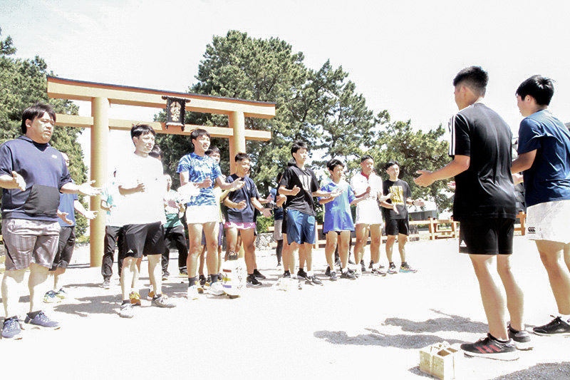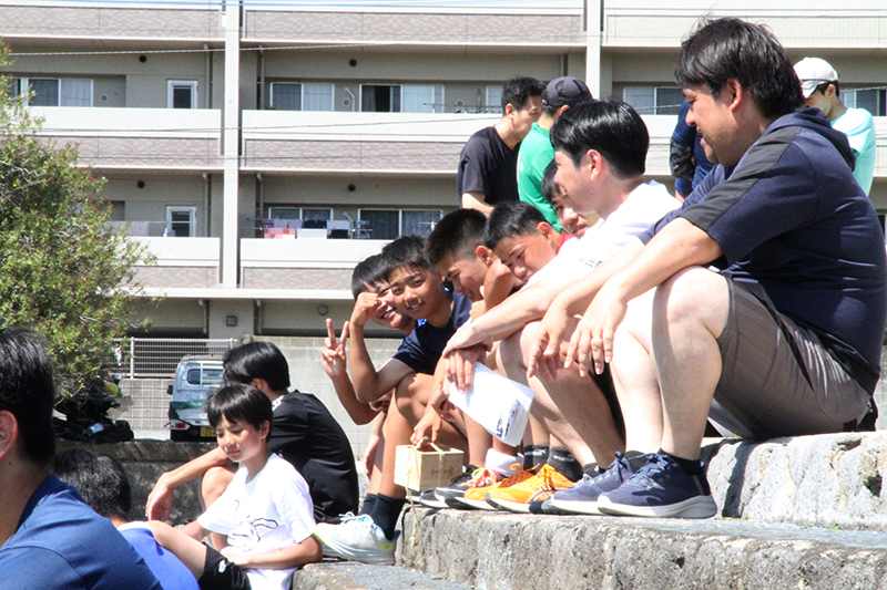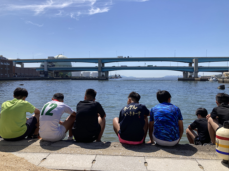 照り付ける太陽の下、走ってきた若者たちは先ずは休憩。青空の下、海を見ながら休憩する姿を見て、先生が「青春やな」と笑います。