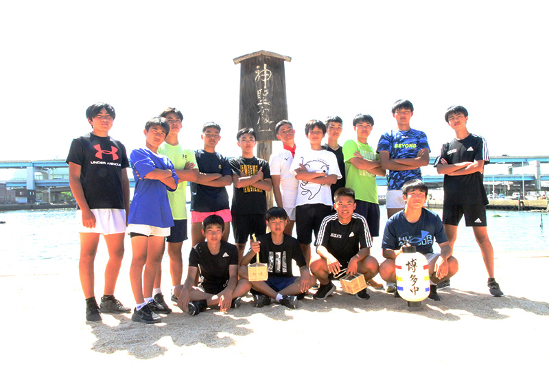 石堂川(御笠川)を渡り、一路筥崎宮へ。筥崎宮より特別に許可をもらって箱崎浜に入った一同は、声を合わせて松の並木道を堂々と走って箱崎浜へ到着。