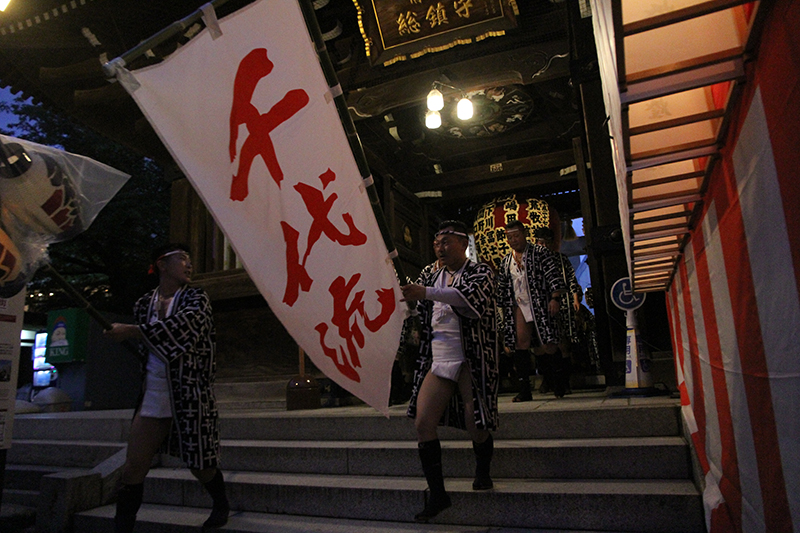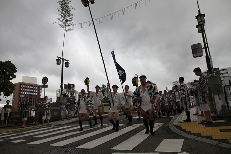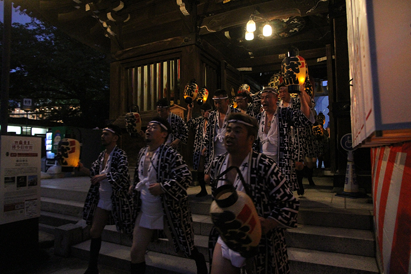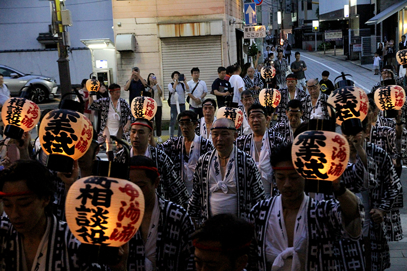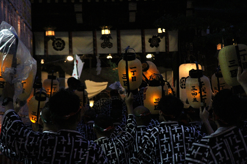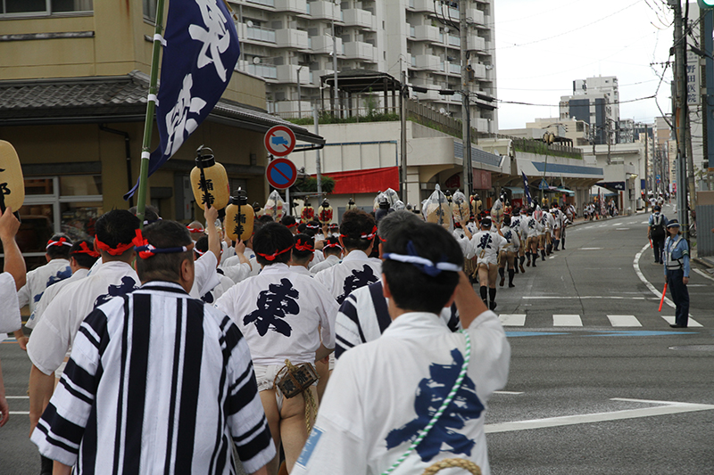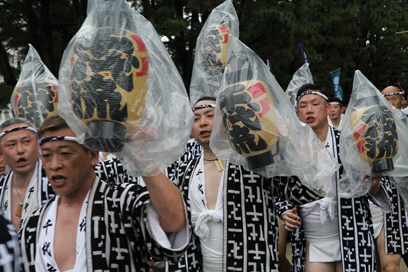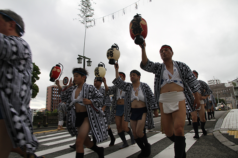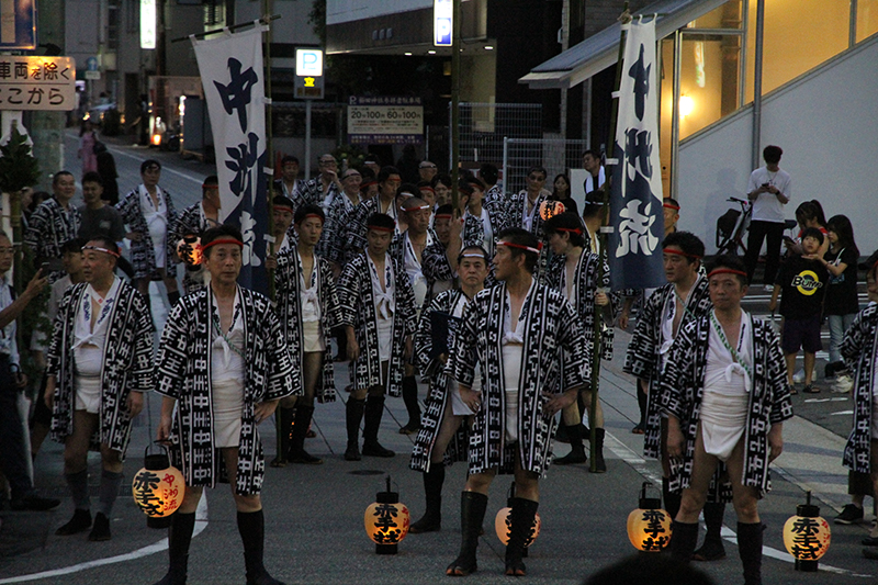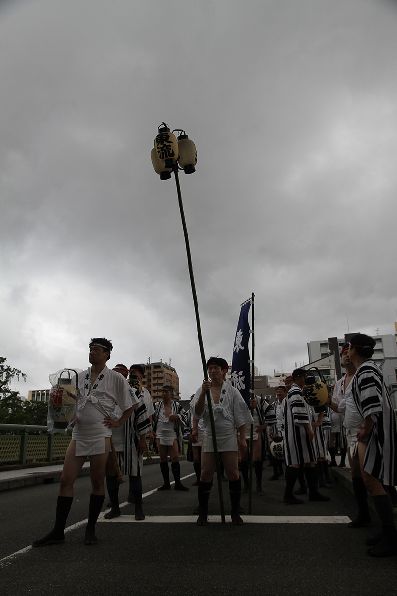 その空の下、午後4時半を過ぎると各流では、当番法被を羽織った流の男たちが弓張提灯や高張提灯などを手にして集合し、出発の時を待ちます。