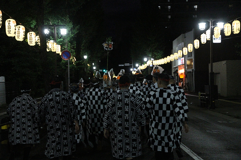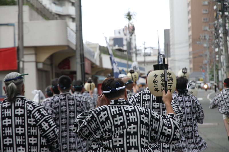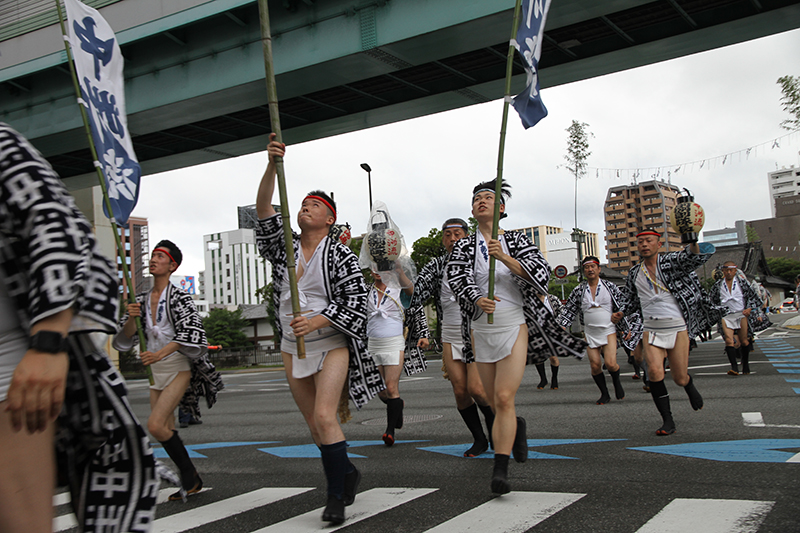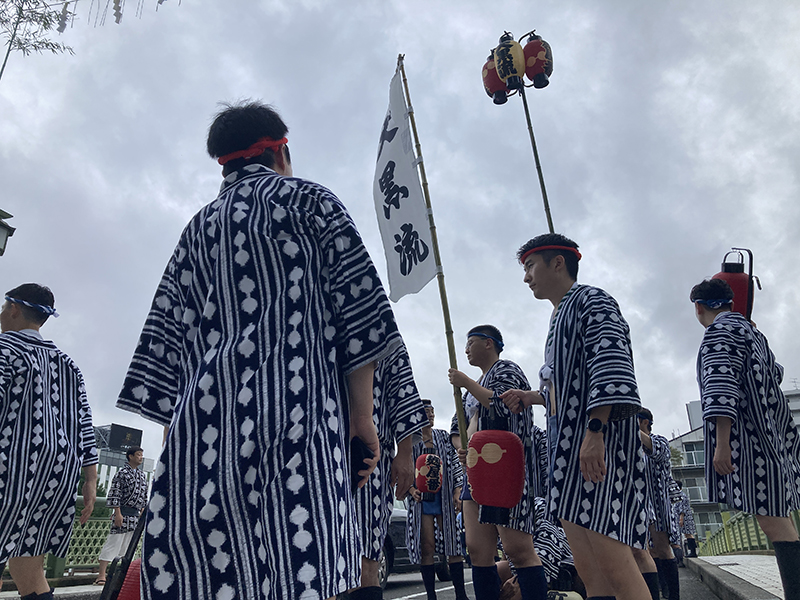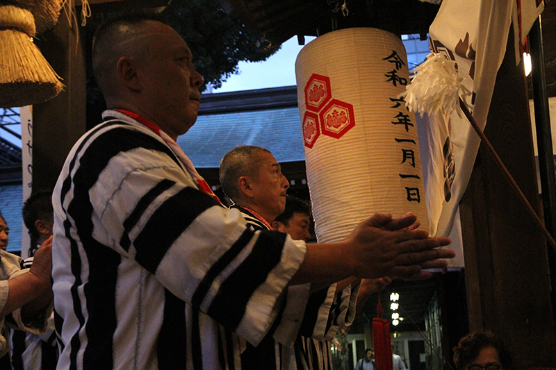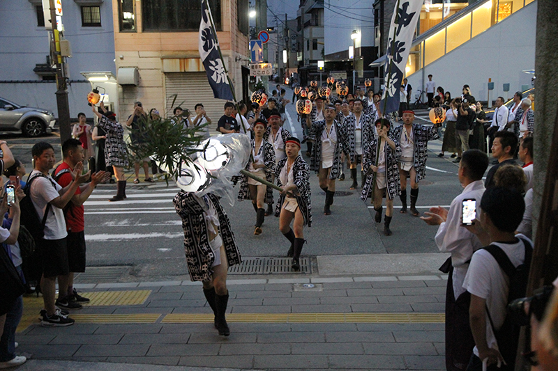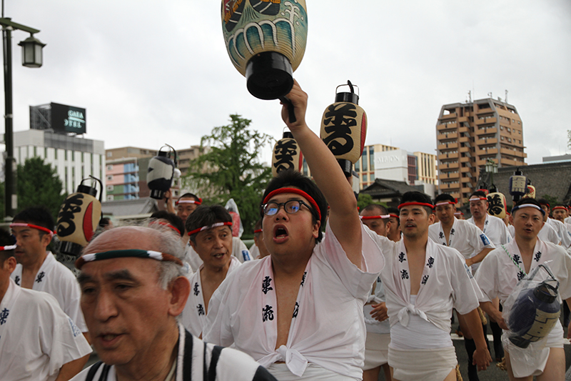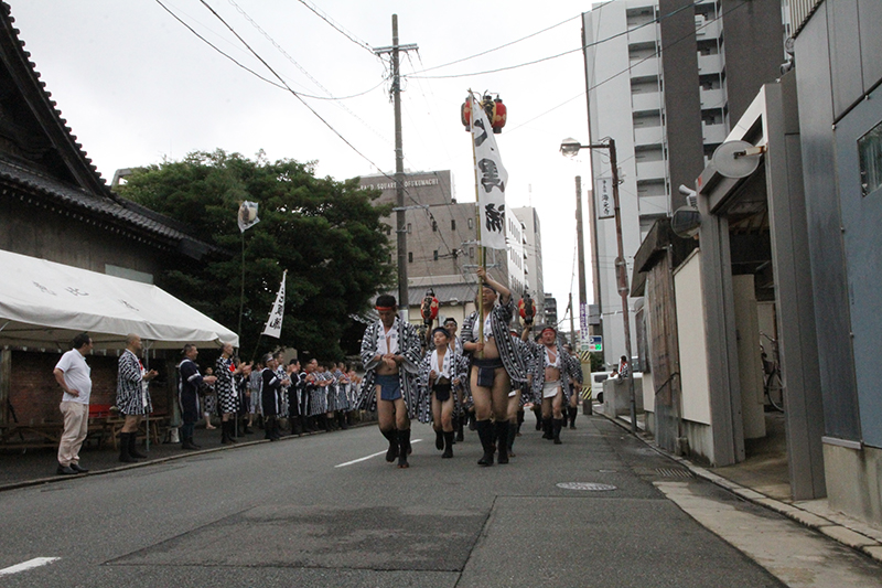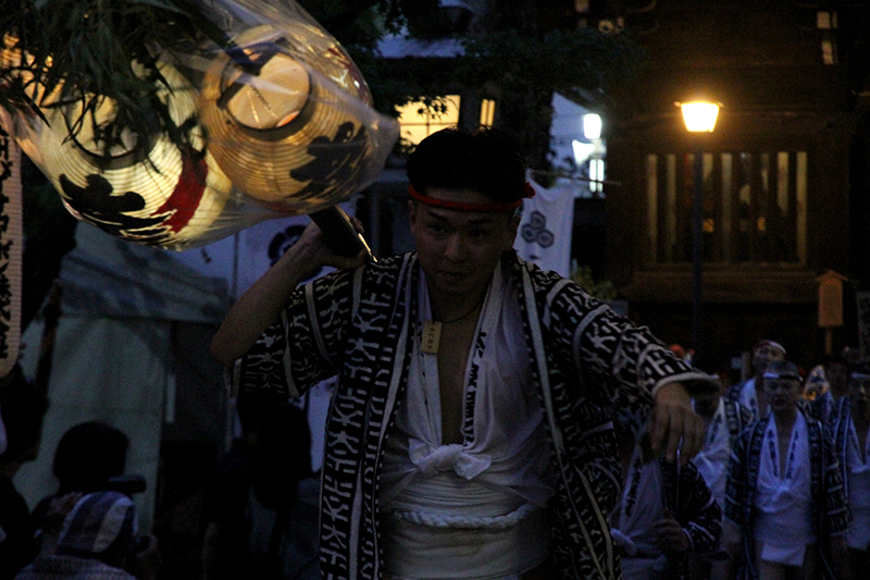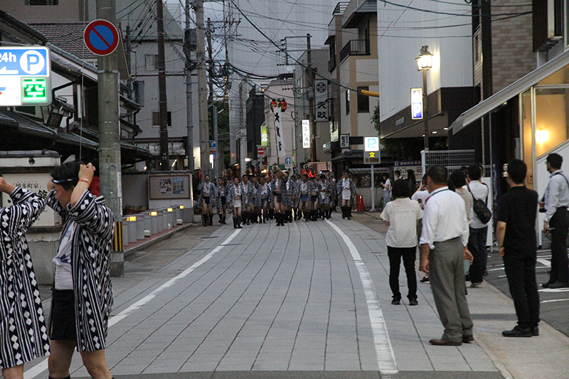 その空の下、午後4時半を過ぎると各流では、当番法被を羽織った流の男たちが弓張提灯や高張提灯などを手にして集合し、出発の時を待ちます。