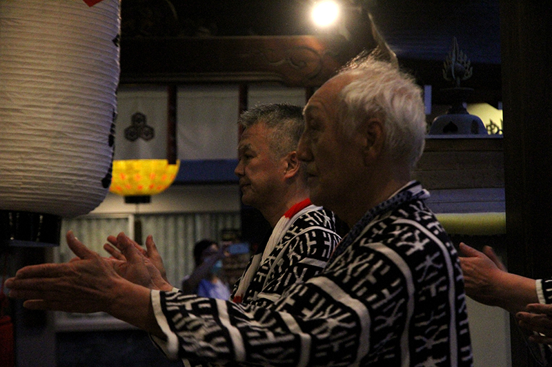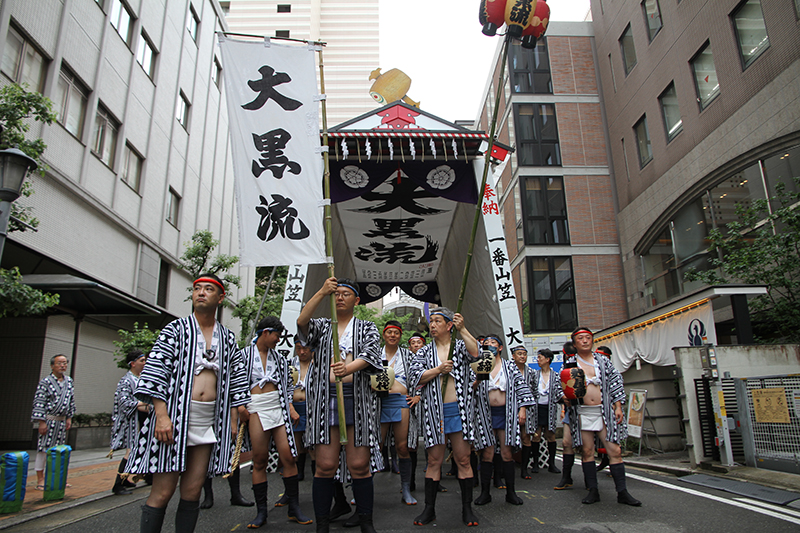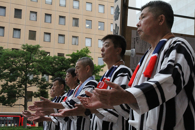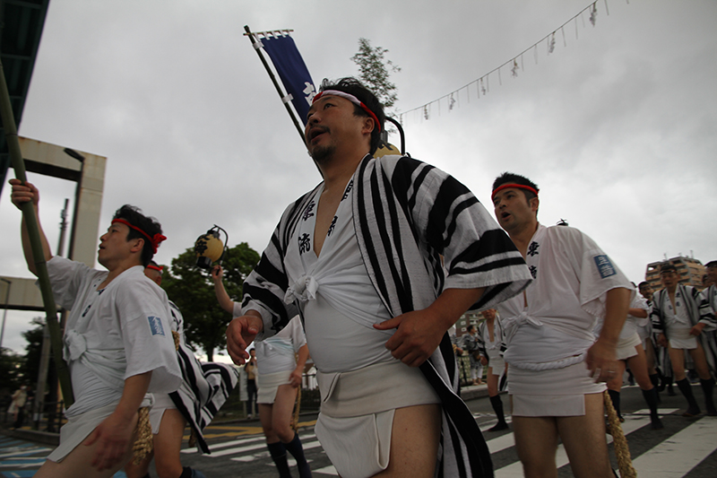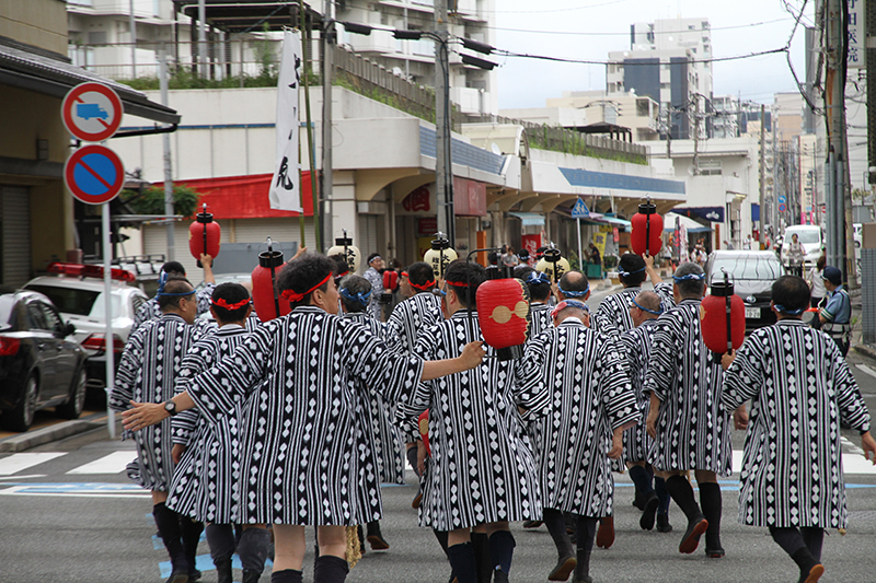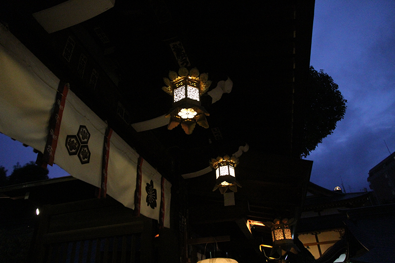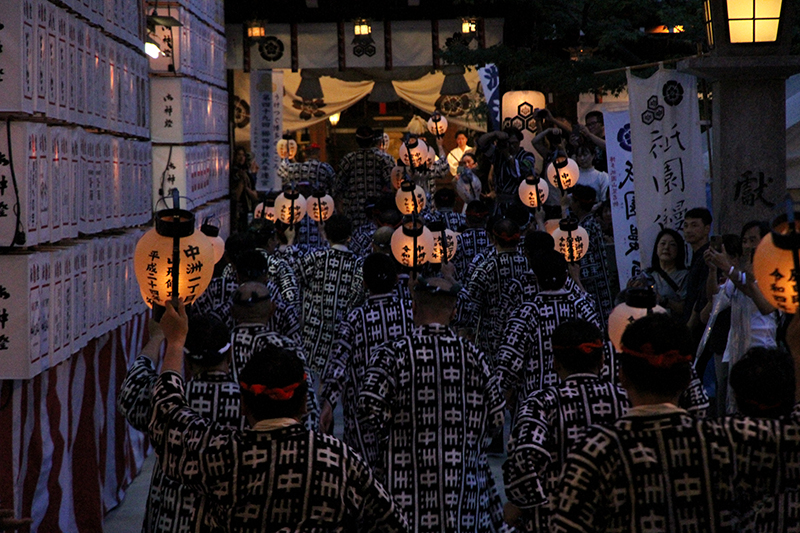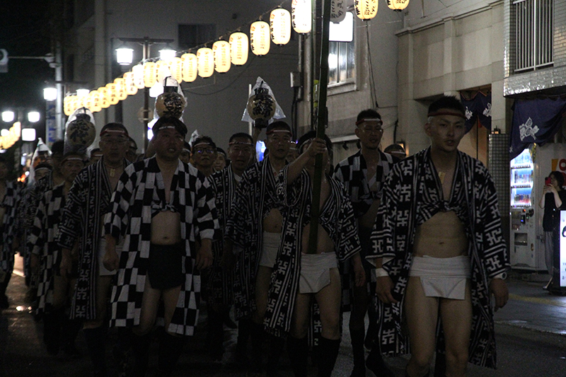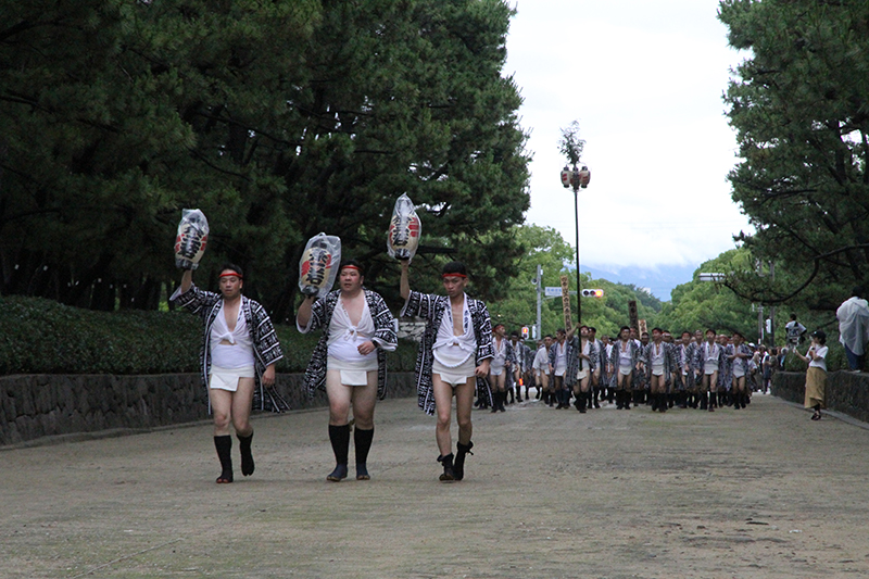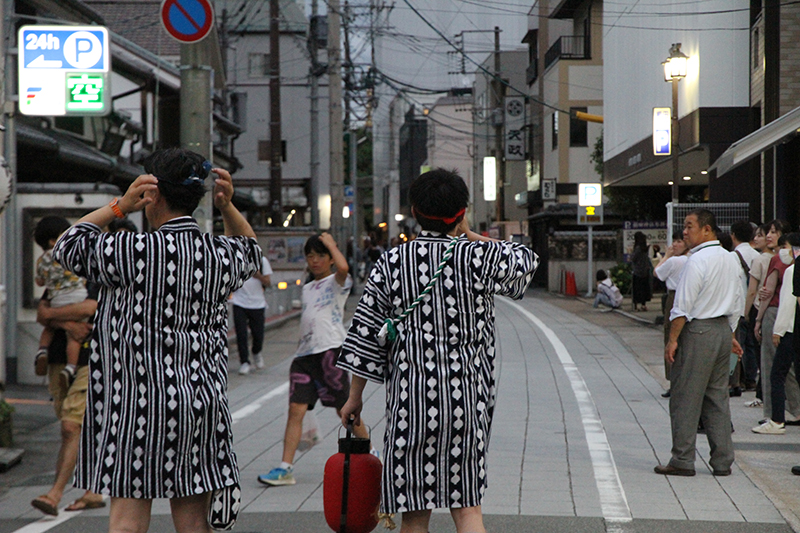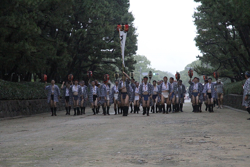 その空の下、午後4時半を過ぎると各流では、当番法被を羽織った流の男たちが弓張提灯や高張提灯などを手にして集合し、出発の時を待ちます。