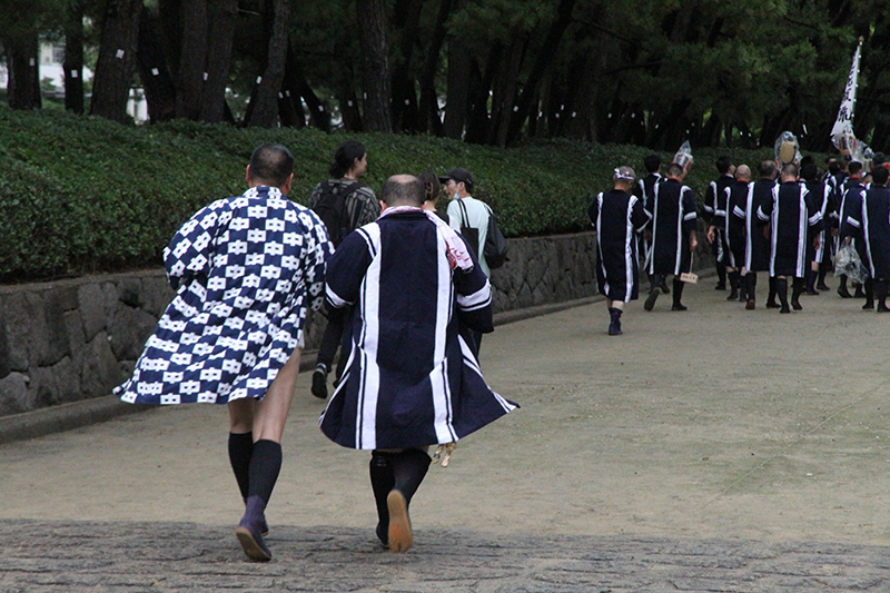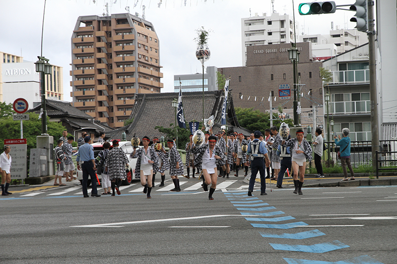 箱崎浜で無事奉納を祈願した七流の参加者は筥崎宮でもお祓いを受けたあと、しばしの休憩後、次は櫛田神社まで再び約6キロの道を走りって参拝に向かいます。