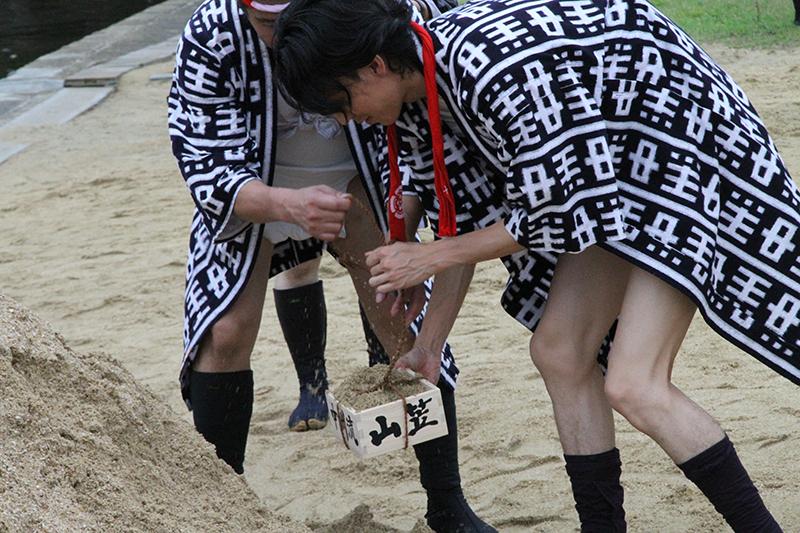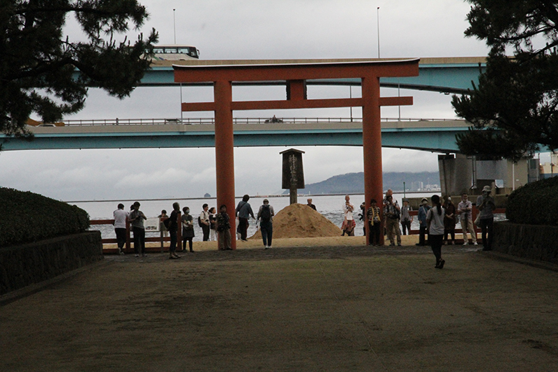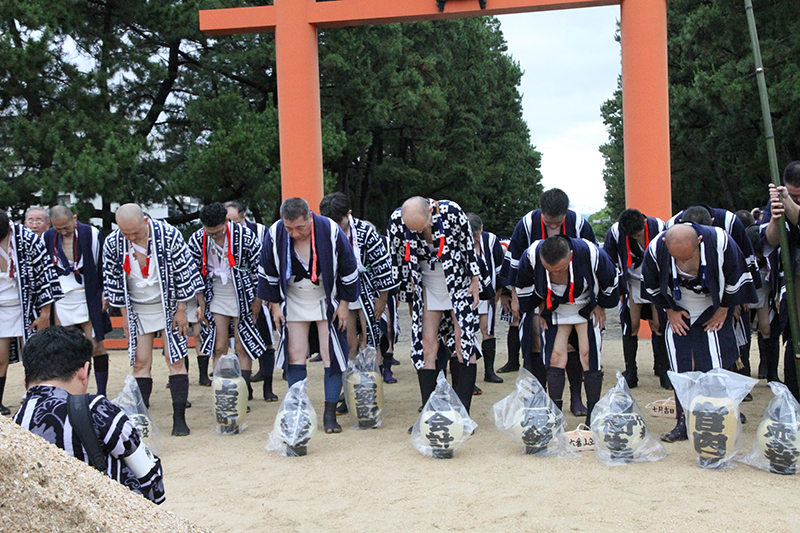 「オッショイ」「オッショイ」と足並みを揃えて鳥居をくぐり、海に向かって礼拝し無事奉納を祈願。手にした桝やてぼ(竹製のカゴ)にお清めの真砂を詰めました。