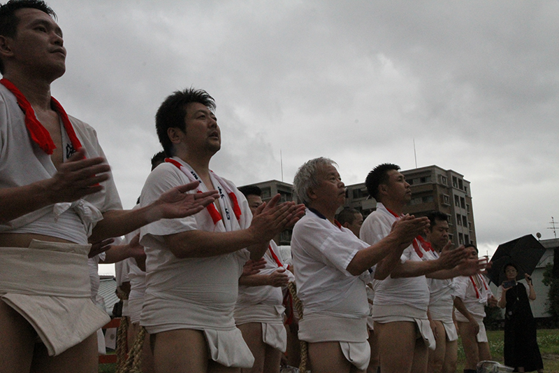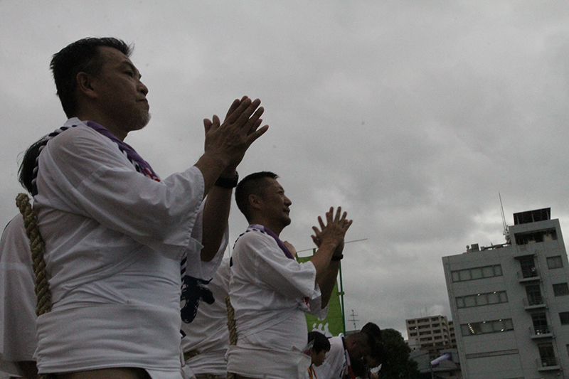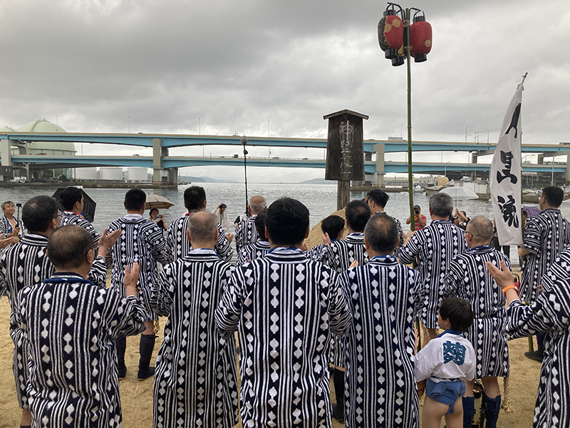 大黒流が到着後、各流れも次々に箱崎浜に到着。雨がパラパラと降る曇天の夕暮れの中、ついにはじまった山笠の無事奉納を祈願します。
