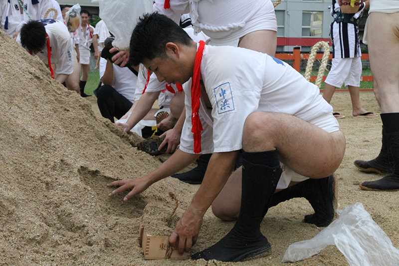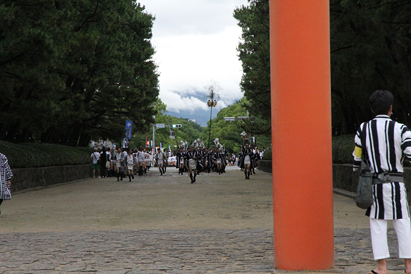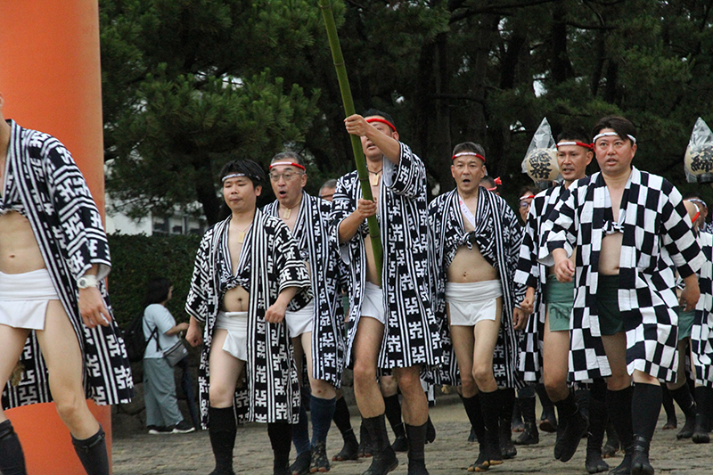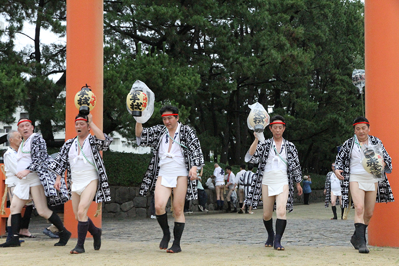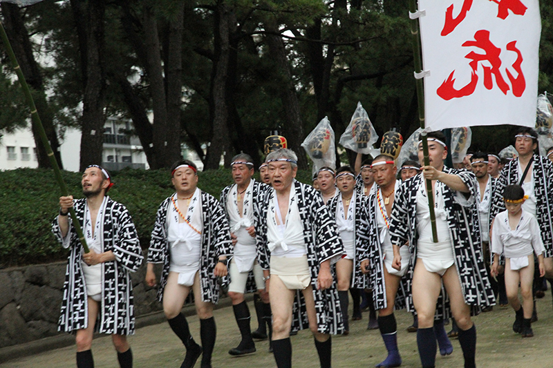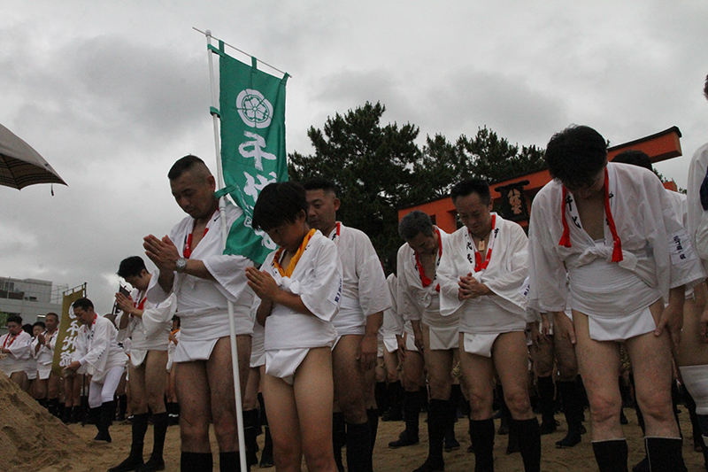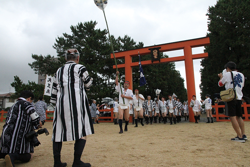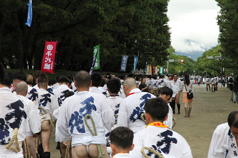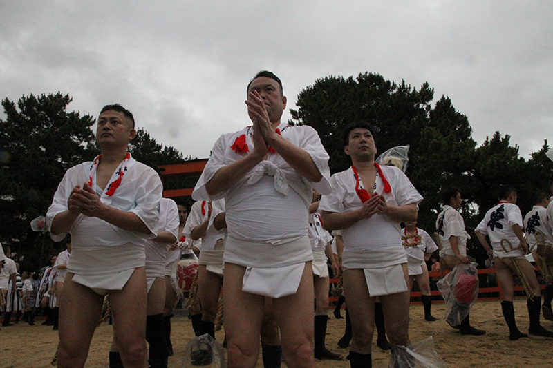 止んでいた雨がポツリポツリと降り始めた筥崎宮の浜。朝からの悪天候が響いたのか、今年は諸事情により写真コンテストが中止となったためか、箱崎浜で男達を待つ人たちや、ベストショットを狙う人たちが少なく感じましたが、それでも熱心なファンがカメラを片手に男達の到着を待ちます。