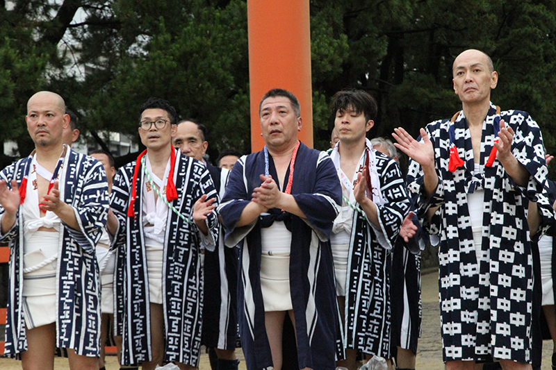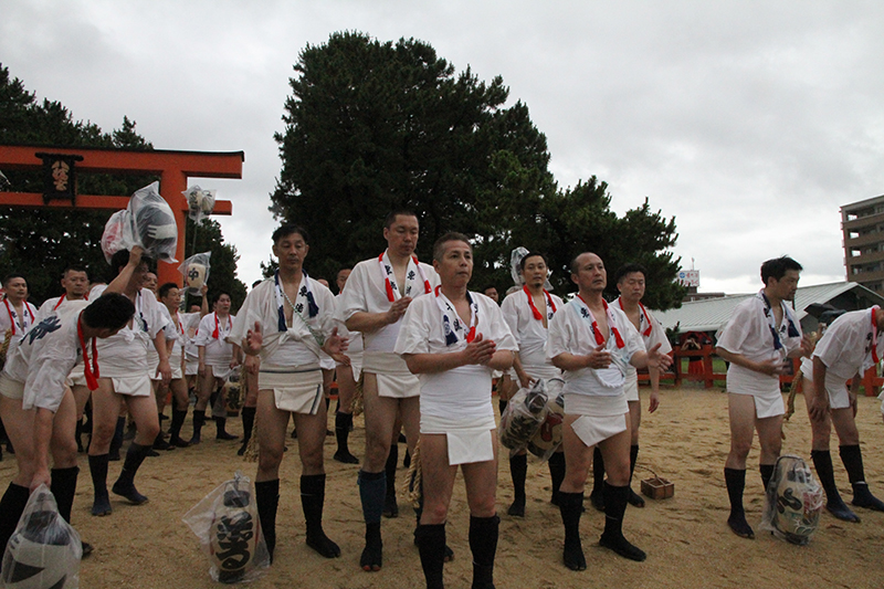 大黒流が櫛田神社を参拝した後、続いて東流、中洲流・・・と次々と箱崎浜から戻ってきた男達が到着。神職たちがシャンシャンとお祓いをする中で参拝し、これからの十五日間を無事安全に奉納できるよう祈願しました。