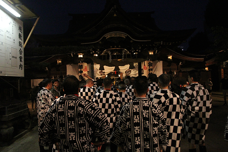 午後8時、七番山笠土居流が櫛田神社に参拝。すっかり辺りは真っ暗に。パラパラと雨が降る中、土居流の男達は山小屋の場所まで戻り「15日間、怪我なく頑張りましょう」と手が入ります。