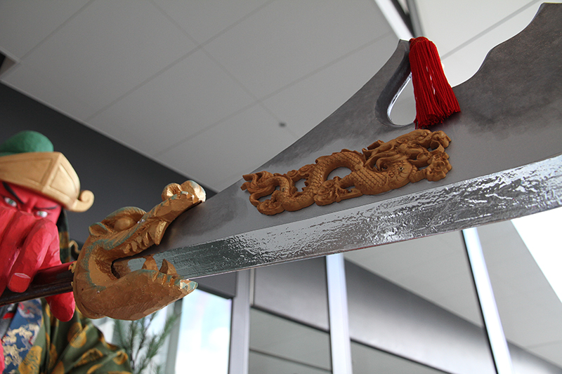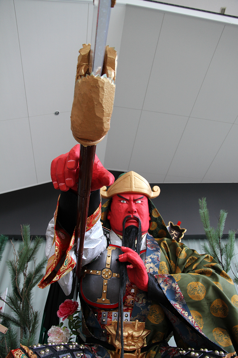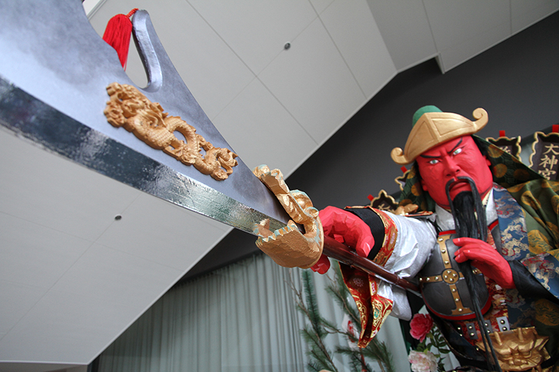 大楠アリーナに入ると、すぐに目に入るのが舁き山笠飾り。飾られているのは、白水英章人形師が製作した三国志の名将・関羽をモチーフにした『凛』(りん)です。後ろ側にも回り込めるので見送り側の飾りも見る事が出来ます。
