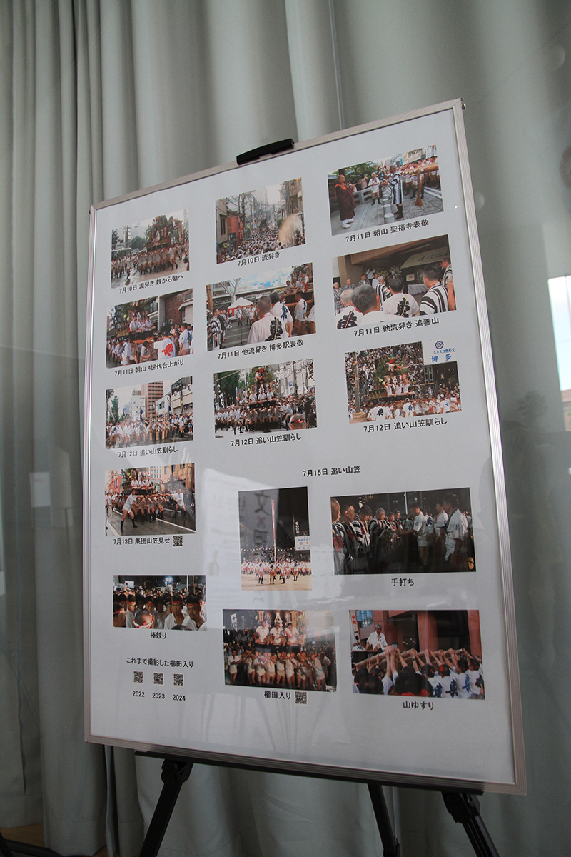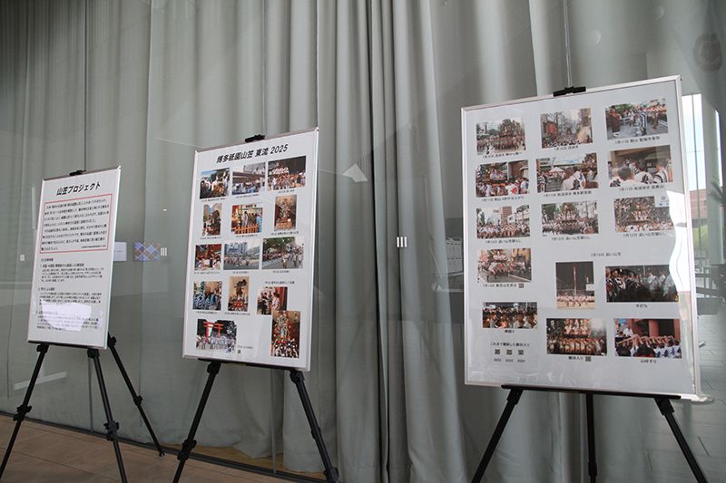 九州産業大学は、地域貢献活動の一環として学生たちが自身の専門性を生かし、伝統ある祭りの継承と地域活性化に貢献するため、多岐にわたる取り組みを展開する「博多祇園山笠プロジェクト」を立ち上げ活動しており、博多祇園山笠「東流」と連携して、飾り山笠の展示や多言語での案内板設置、学生による飾り山笠のPR写真撮影など、地域との交流を深めています。飾りの横には活動を紹介するパネルやリーフレットなどが置かれており、学生らの活動内容を知ることが出来ます。
